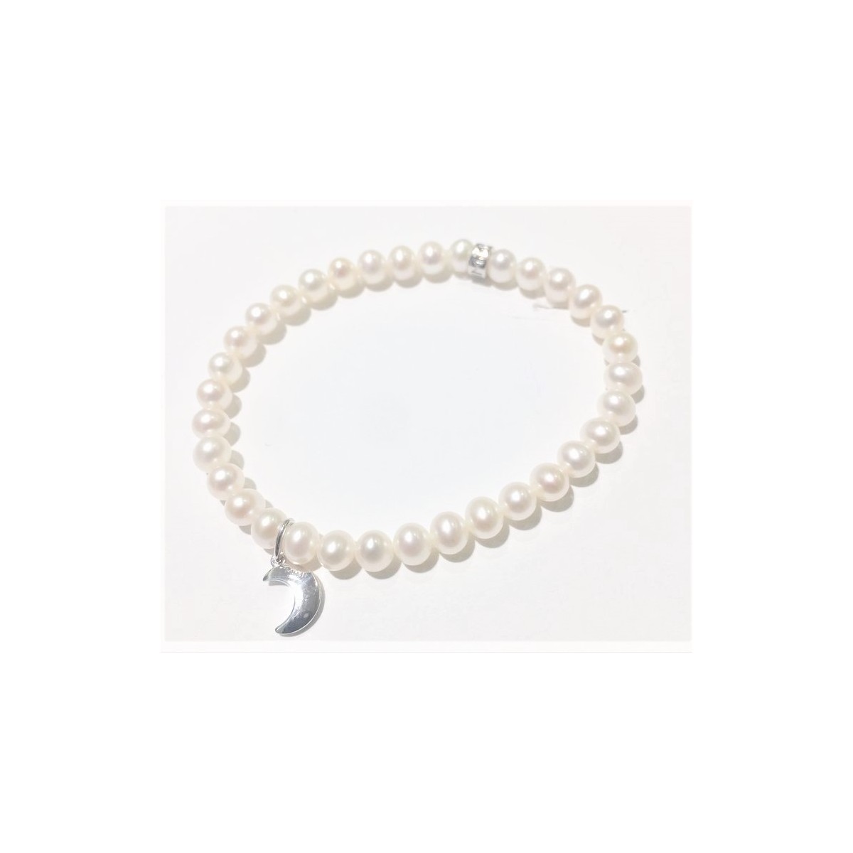 Variante del classico bracciale elastico con pendente in argento 925 a forma di luna, abbinato ad una perla coltivata di colore bianco con il dadino logato Mimì