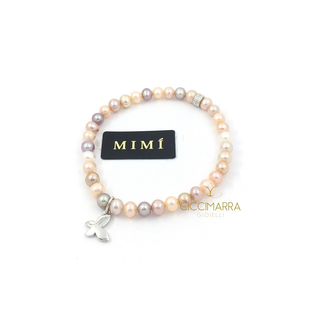 Variante del classico bracciale elastico con pendente in argento 925 a forma di farfalla, abbinato ad una perla coltivata multicolor con il dadino logato Mimì