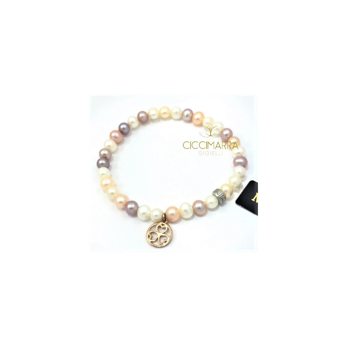 Variante del classico anello elastico con pendente in oro rosa 9kt a forma di cerchio con tre cuori a trifoglio, abbinato ad una perle coltivate di vario colore, lilla - crema e bianche, con il dadino logato Mimì