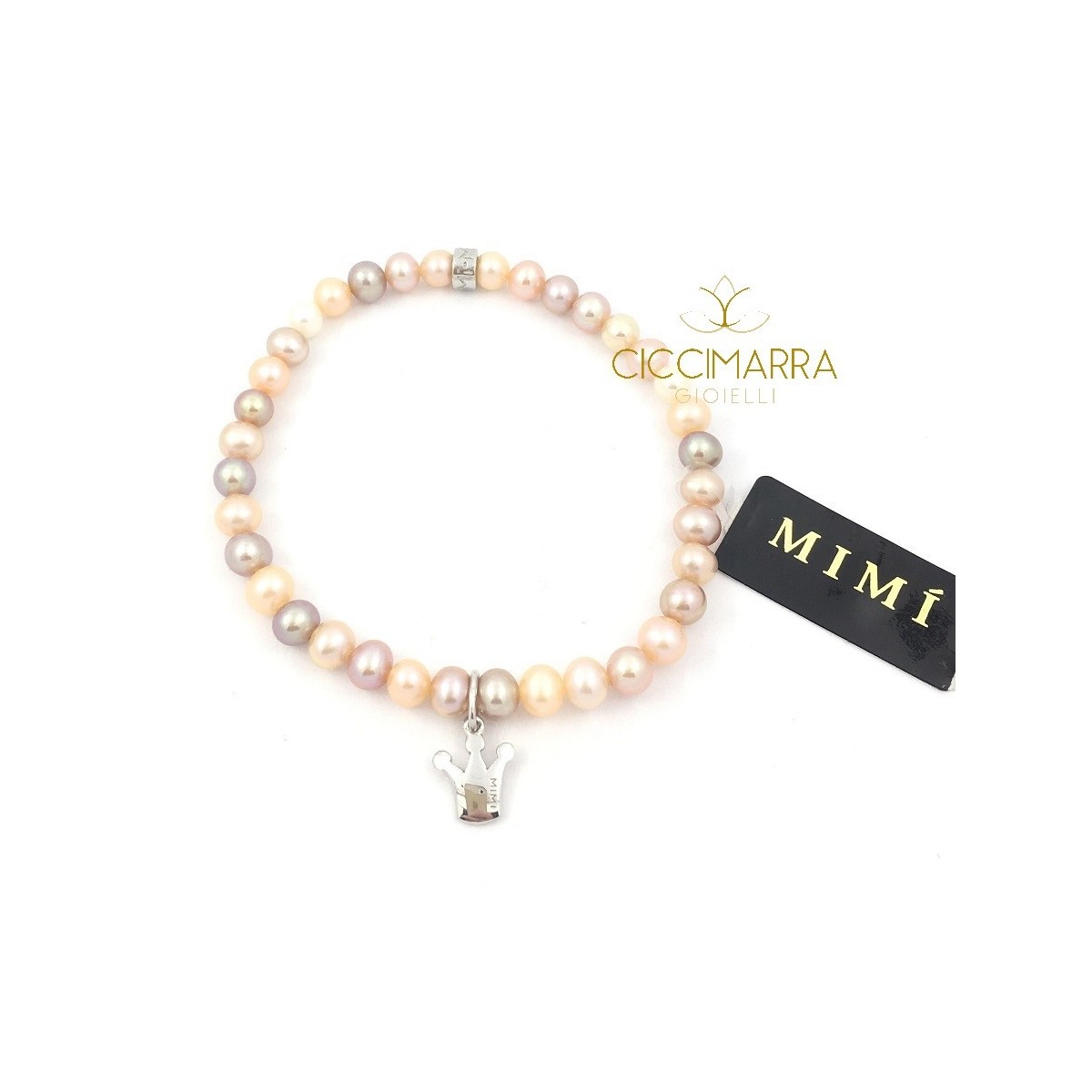 Variante del classico bracciale elastico con pendente in argento 925 a forma di corona, abbinato ad una perla coltivata multicolr con il dadino logato Mimì