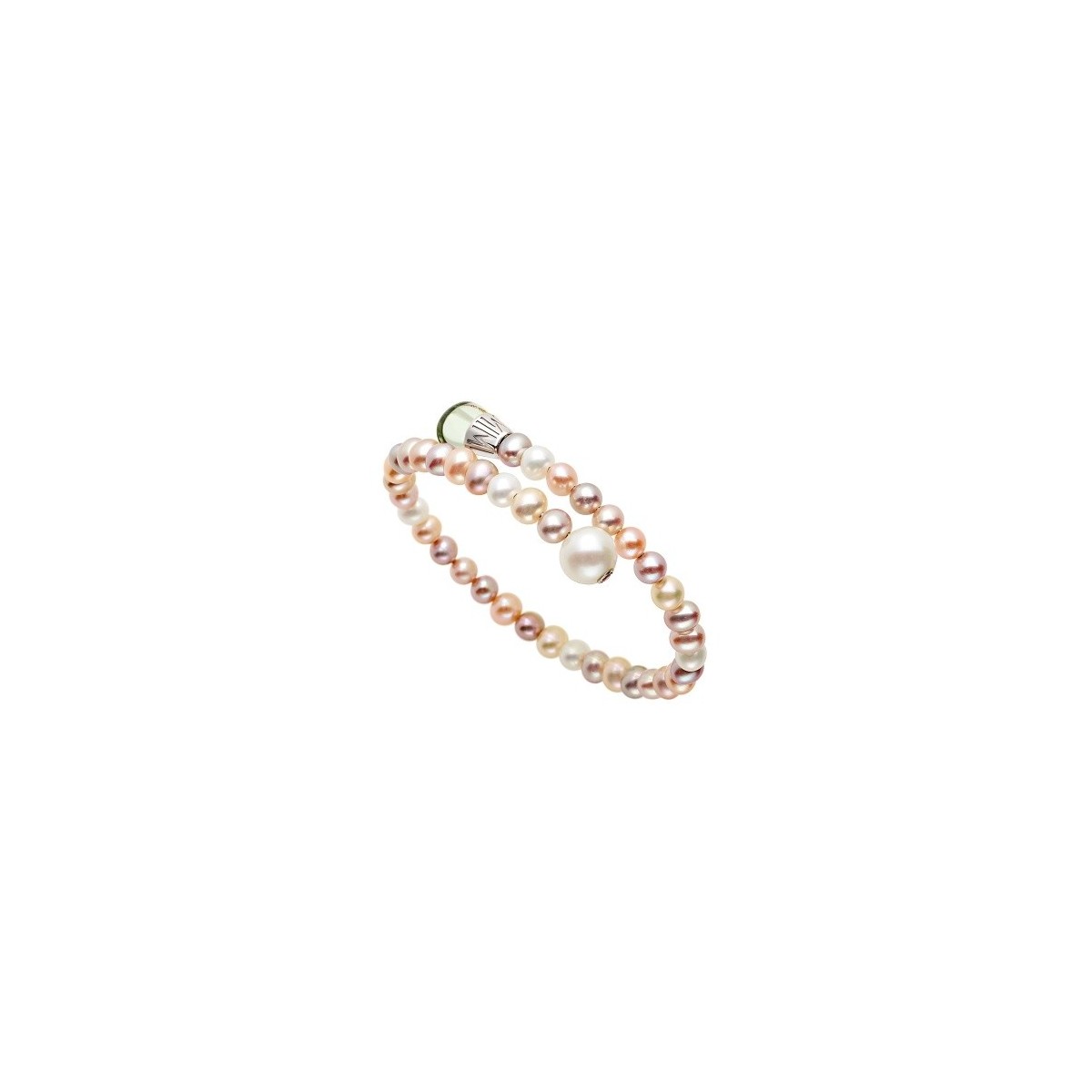 Linea Lollipop di Mimì Gioielli, questo bracciale semirigido è composto da un giro di perle coltivate multicolor, lilla bianche e crema, da 5/6 mm montate su di una base a spirale in titanio e con terminali in argento 925 con logo inciso sui quali è montato da un lato una stupenda prasolite verde chiaro cabochon e dall'altro una perla più grande con incastonato uno zaffiro arancione naturale.