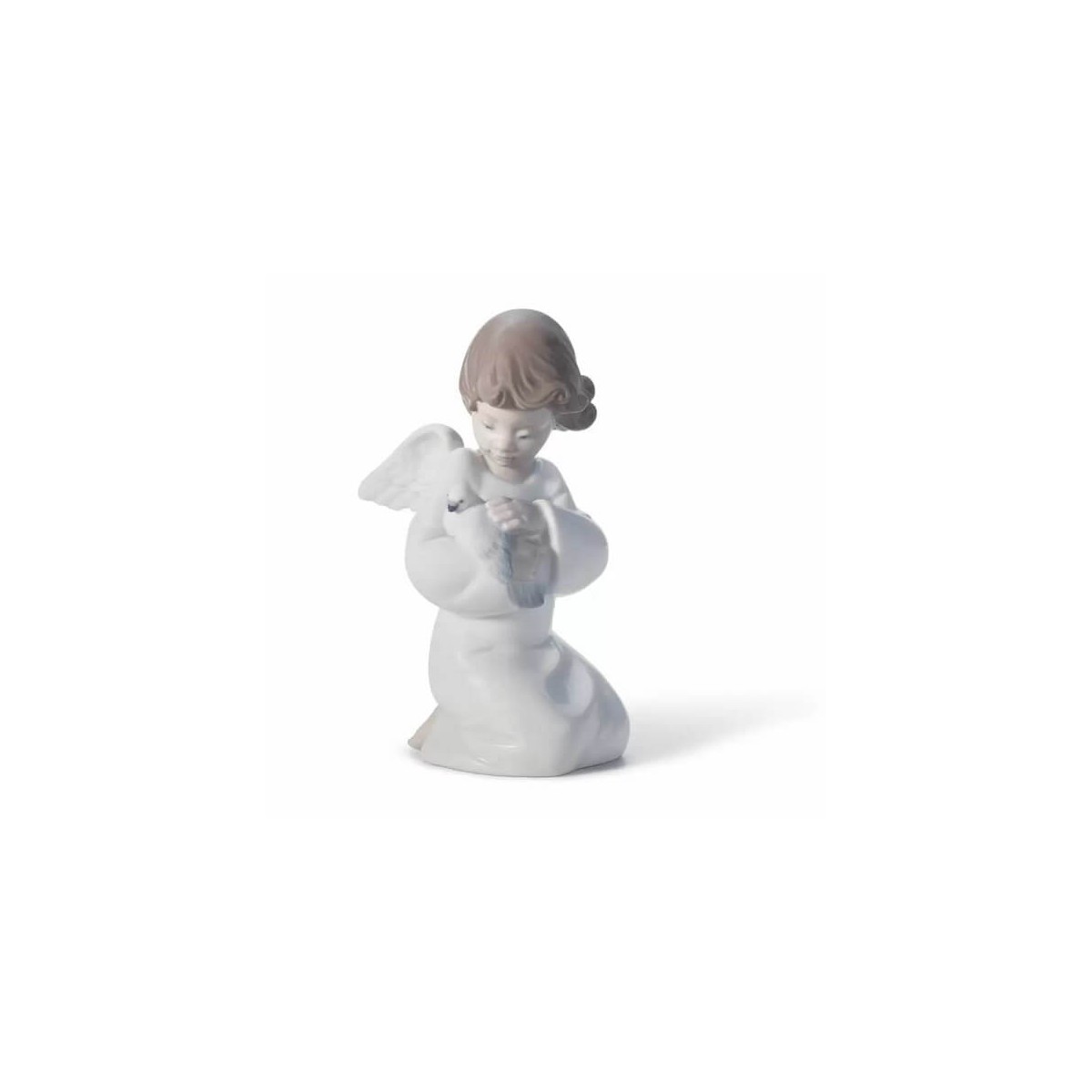 Statua Lladrò in porcellana bianca, della collezione Utopía, realizzata a mano dallo scultore José Santaeulalia, rappresentante una figura scintillante di angelo che cattura un piccione con sciocchi blu morbidi. Un angelo accoglie una colomba in grembo, un simbolo di pace, e il suo gesto evoca la natura di anime gentili che si preoccupano sempre degli esseri indifesi. Il desiderio di Lladró di trasmettere valori positivi si unisce a questa figura spiritualità, uno dei temi fondamentali per gli artisti di Lladró.