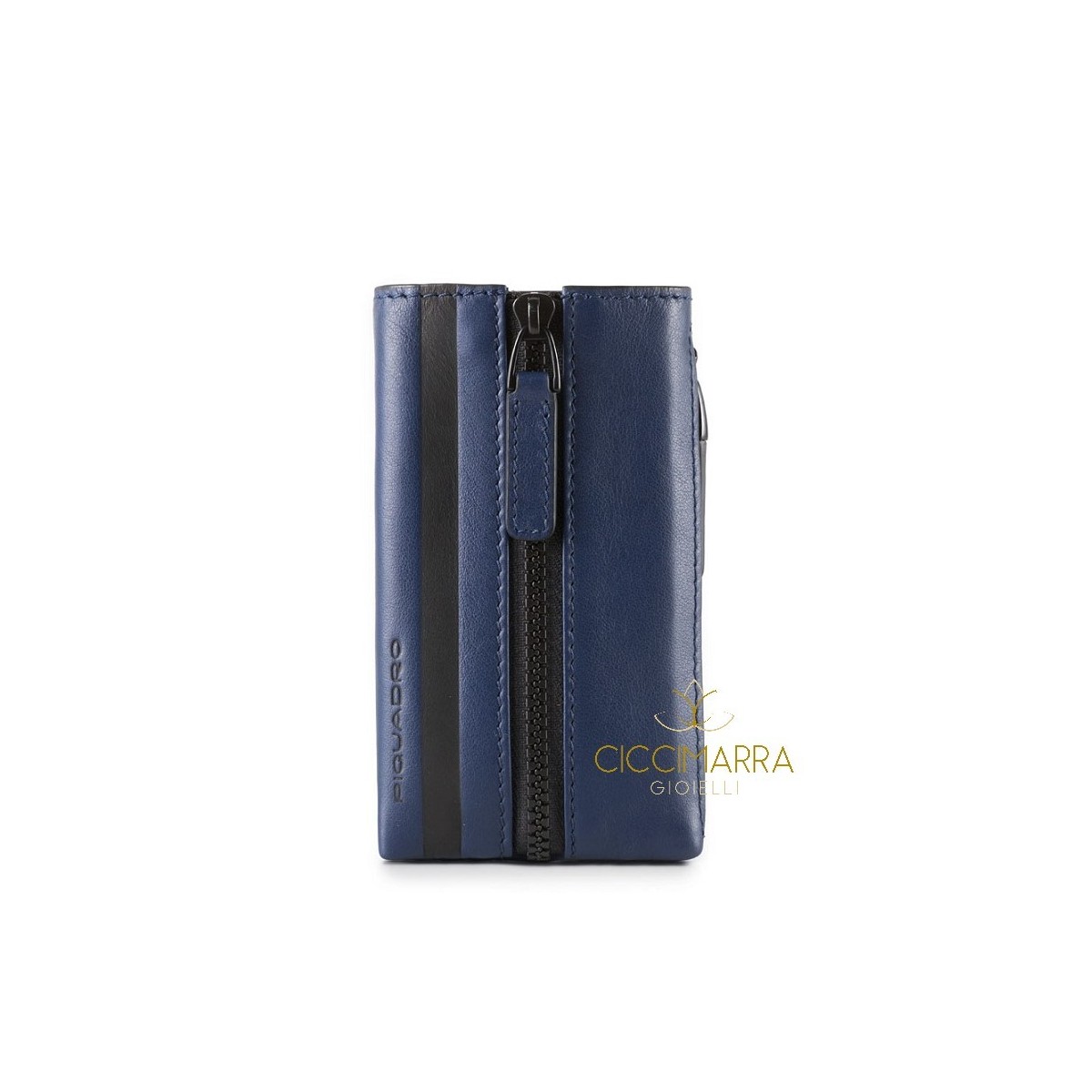 Portachiavi uomo/donna in pelle di colore blu con chiusura a zip e 6 ganci. Sulla parte posteriore è presente un piccolo taschino con zip che può essere utilizzato per gli spiccioli o un telecomando. La linea Setebos è caratterizzata da forme morbide e finiture in contrasto nere; la pelle di vitello ha un finish semilucido morbido al tatto.