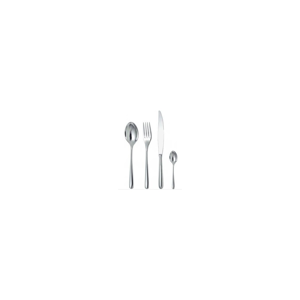 Servizio di posate composto da sei cucchiaini da tavola, sei forchette da tavola, 4 rebbi, sei coltelli da tavola, sei cucchiaini da tè in acciaio inossidabile disegnate dai designer Luigi Caccia, Livio e Pier Giacomo Castiglioni.