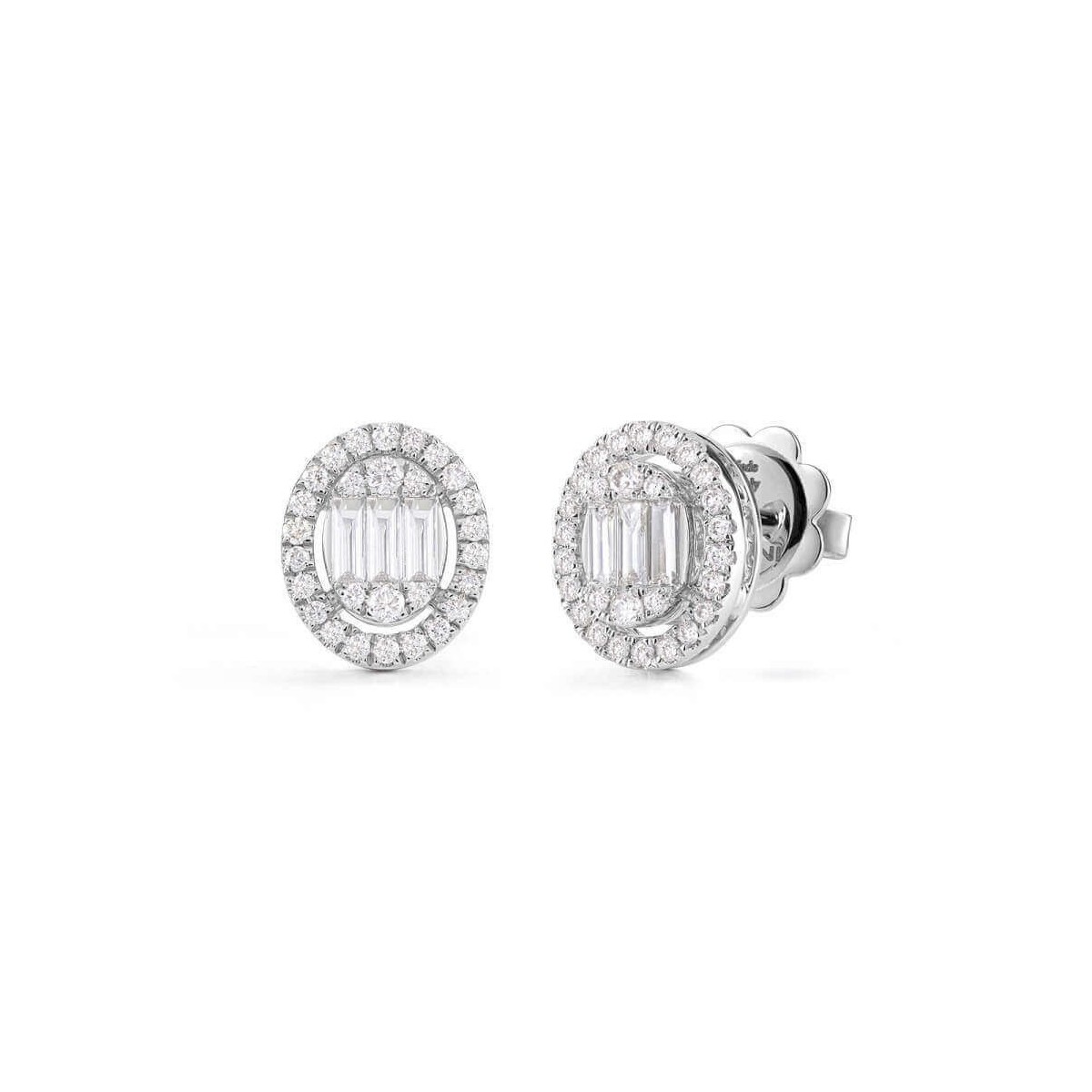 Orecchini a lobo dalla forma ovale Salvini con punto luce della nuova collezione Magia realizzata in oro bianco 18 carati e diamante naturale centrale taglio baguette 0,12 carati totali e cornice di diamantini 0,18 carati totali. Chiusura a farfallina.