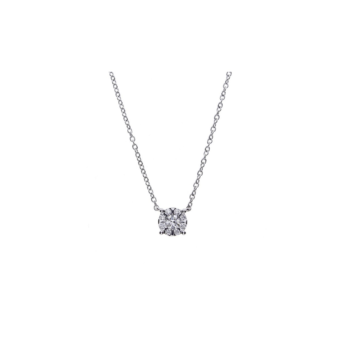 Collana donna Salvini, della collezione Daphne, realizzata in prezioso oro bianco 18 carati con pendente composto da diamante centrale naturale taglio brillante da 0,15 carati contornato da sette piccoli diamanti naturali taglio brillante 0,15 carati totale.