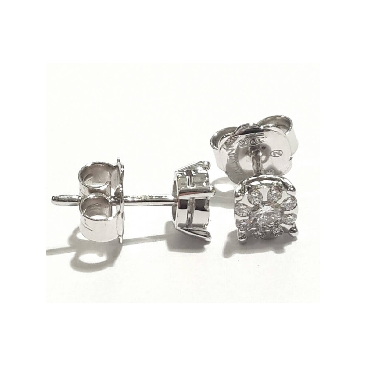 Orecchini punto luce con castone composto a mosaico, il castone è formato da un diamante centrale e 8 diamanti in contorno. Diamanti naturali taglio brillante di forma rotonda, incassati a mosaico.