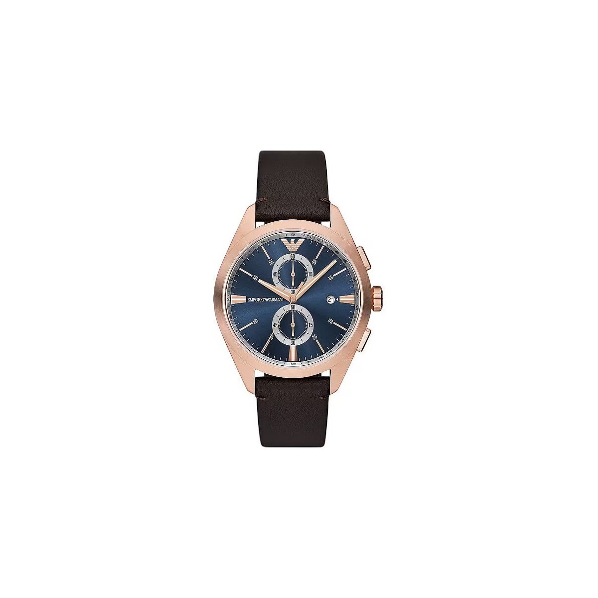 Orologio da uomo della maison Armani, con funzione di cronografo al quarzo. L'orologio presenta un bracciale in pelle marrone pro-planet con finitura opaca. Realizzato in acciaio inossidabile con cassa di forma rotonda dalla finitura satinata di colore oro rosa. Quadrante di colore blu. Chiusura ad ardiglione.