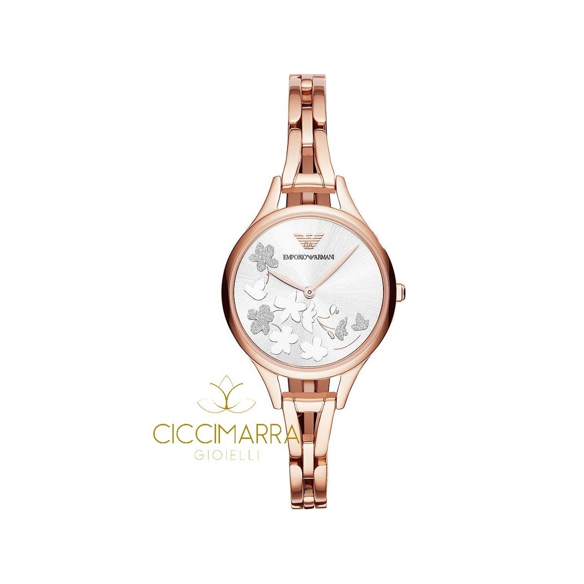 Cassa in acciaio inossidabile oro rosè del diametro di 32mm e dello spessore di 7mm con ghiera fissa; quadrante silver con decorazione di foglie glitter senza numeri né indici e con lancette oro rosè. Il bracciale è in acciaio inossidabile oro rosè con chiusura deployant.