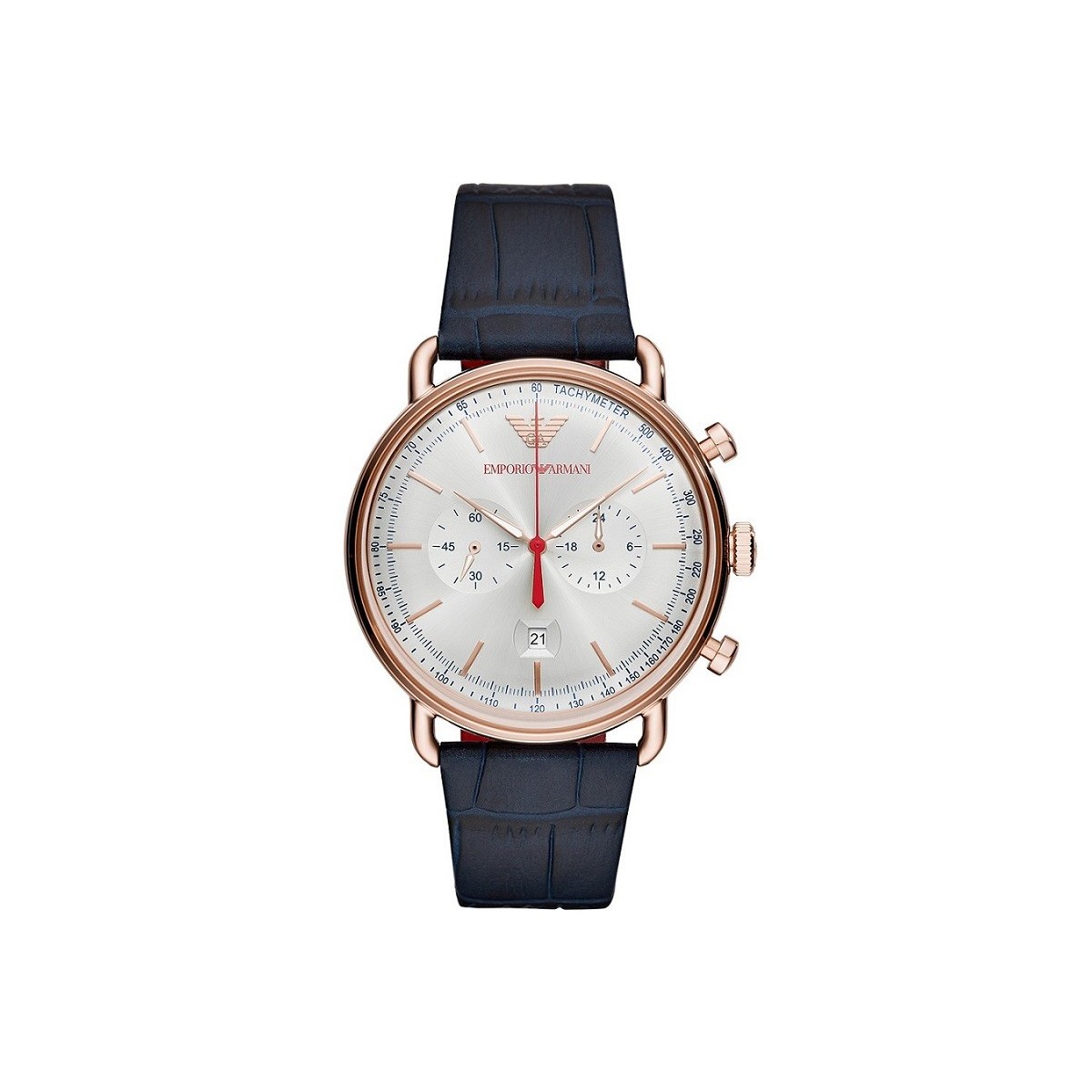 La linea Aviator di Emporio Armani un modello anni 50 con design attuale, particolare il cinturino in pelle stampa coccodrillo di colore blu con interno rosso