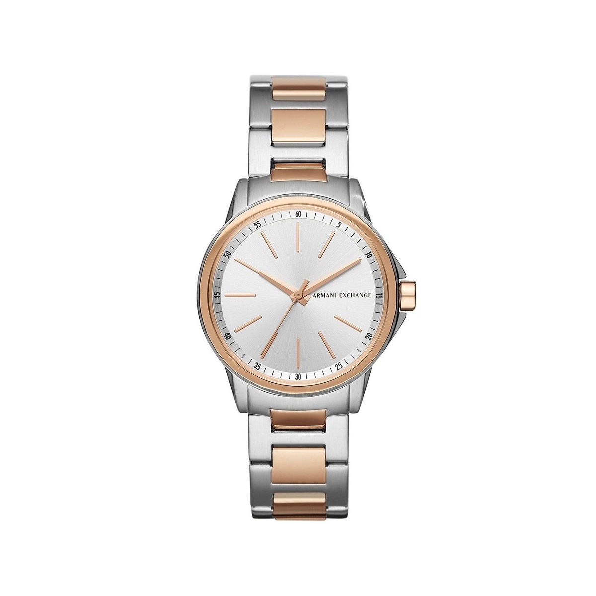 Orologio donna Exchange Nuova linea dello stilista Giorgio Armani che unisce in ogni modello tutte le caratteristiche migliori delle linee più accattivanti delle ultime collezioni di maggiore tendenza.Per la donna che esprime il suo stile attraverso gli accessori, un orologio elegante e di classe ma allo stesso tempo essenziale con cassa in acciaio, cinturino bicolor quadrante silver con indici e lancette rosè e ghiera fissa oro rosa.