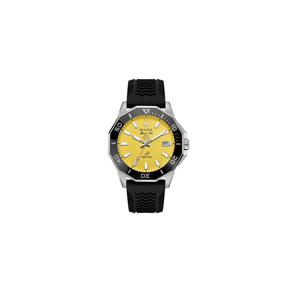 Orologio uomo Bulova, della collezione Marine Star, con funzione di solo tempo e movimento al quarzo. L'orologio è realizzato con cassa in acciaio dal diametro di 43 mm, con lunetta rotante in ceramica. Quadrante giallo realizzato con una texture che ricorda le onde dell' oceano, datario a ore 3, con vetro zaffiro piatto con trattamento antiriflesso. Dotato di fondello a vite e ad alimentarlo troviamo un movimento HPQ. Cinturino in silicone nero, chiusura ardiglione.