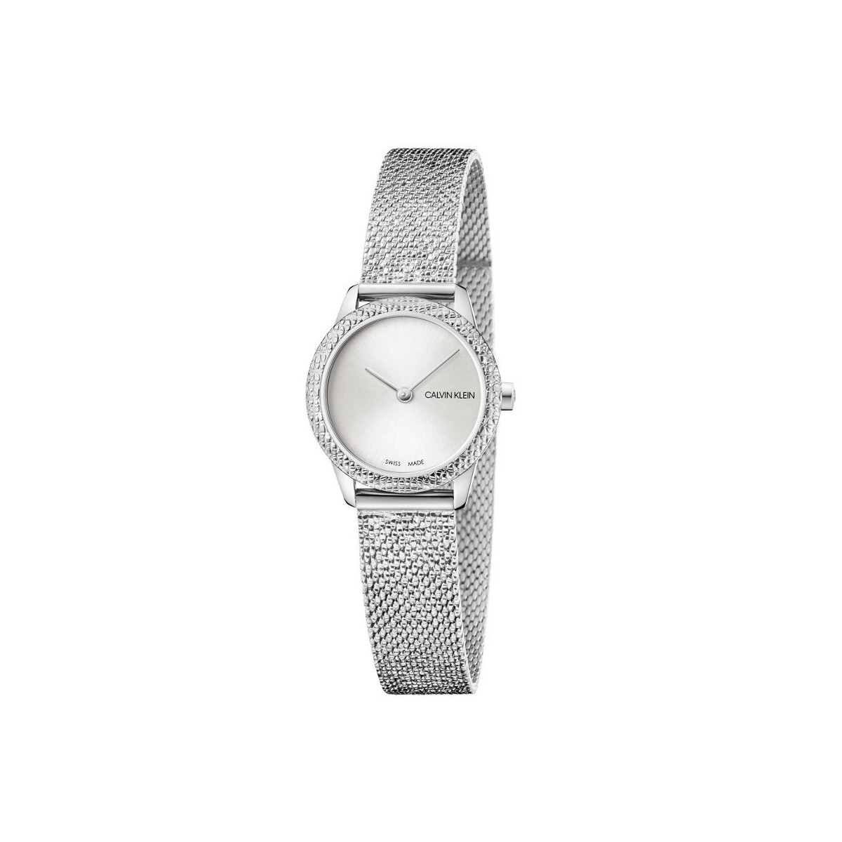 Orologio Calvin Klein donna nuovissima collezione Minimal Small in acciaio inox con quadrante colore argento. Movimento analogico al quarzo Swiss Made. Cassa rotonda in acciaio inox diametro mm. 24,00 con spessore mm. 6,00. Lunetta esterna con decorazione a rilievo. Corona impermeabile logata CK. Fondello in acciaio inox lucido chiuso a pressione ed impermeabile a 3 ATM. Quadrante colore grigio argento satinato con lancette ore e minuti in metallo rifinito lucido. Logo Calvin Klein a ore 3. Vetro minerale temperato. Il bracciale è in acciaio in maglia Milano con una particolare lavorazione eseguita in superfice che lo rende luminoso e brillante. Larghezza bracciale mm. 17,80. Chiusura scorrevole che permette di far scivolare il cinturino attraverso essa e di bloccarla alla larghezza desiderata. Questo rende possibile l'indosso a polsi piccoli ma anche a polsi più robusti. L'orologio steso raggiunge una lunghezza totale di cm. 22,00.