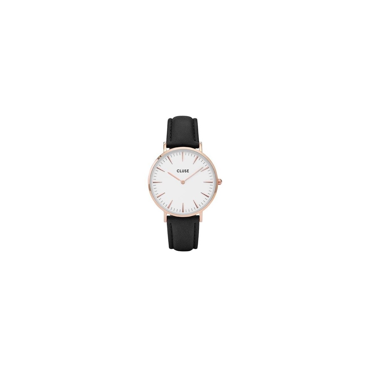 Orologio CLUSE Collezione: La Boheme, la forma del quadrante è tonda di colore bianco, il cinturino è in pelle nera, cassa placcata oro rosa, movimento al Quarzo MVT. MIYOTA 2025 2/SFERE unisex.