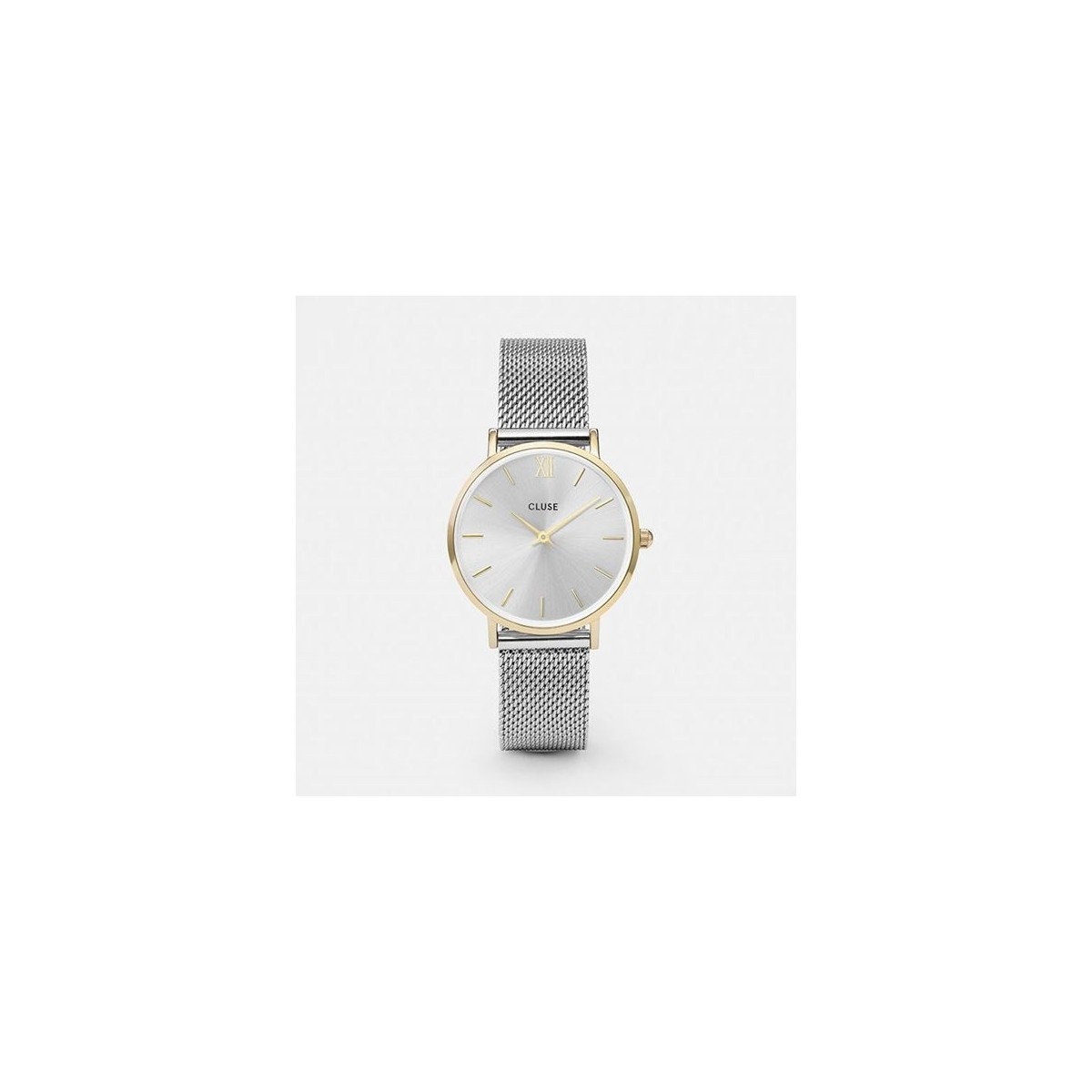 Orologio CLUSE Collezione: Minuit, la forma del quadrante è tonda di colore bianco, il cinturino in acciaio inox con maglia milanese e la cassa rivestita oro, movimento al Quarzo MVT. MIYOTA 2025 2/SFERE vestibilità unisex novità