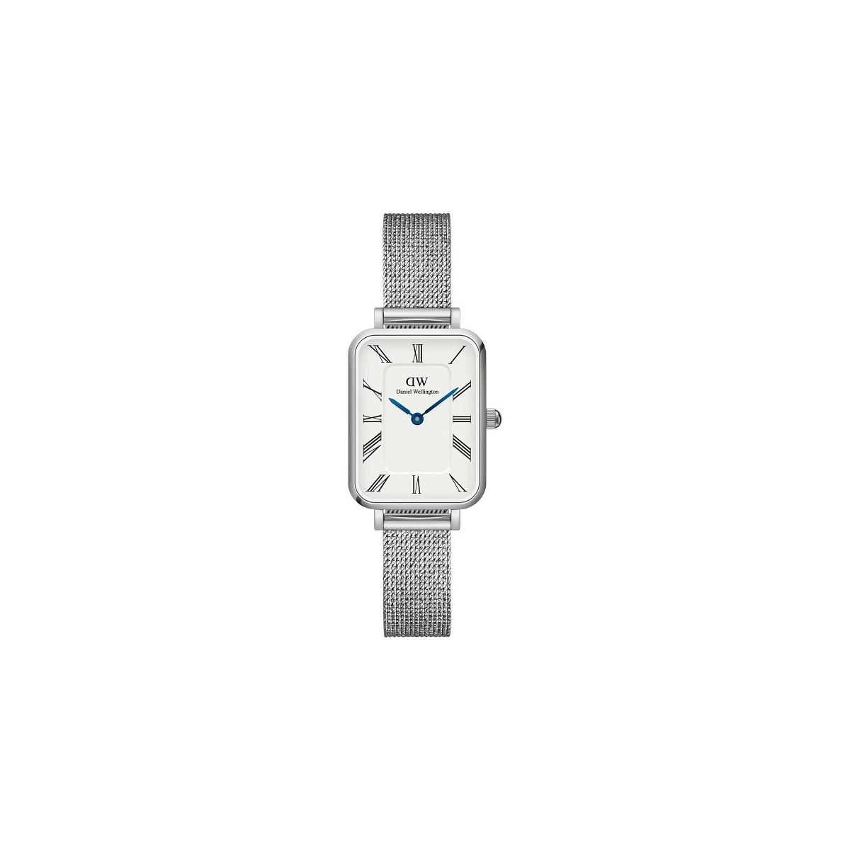 Orologio donna Daniel Wellington, della collezione Quadro Roman, con funzione di solo tempo e movimento al quarzo. L'orologio è realizzato con cassa in acciaio inox dal diametro di 20 mm x 26 mm e spessore di 6 mm. Quadrante bianco con indici a numeri romani e lancette azzurre, cinturino in maglia milano d'acciaio anallergenico; chiusura con fermaglio di sicurezza.