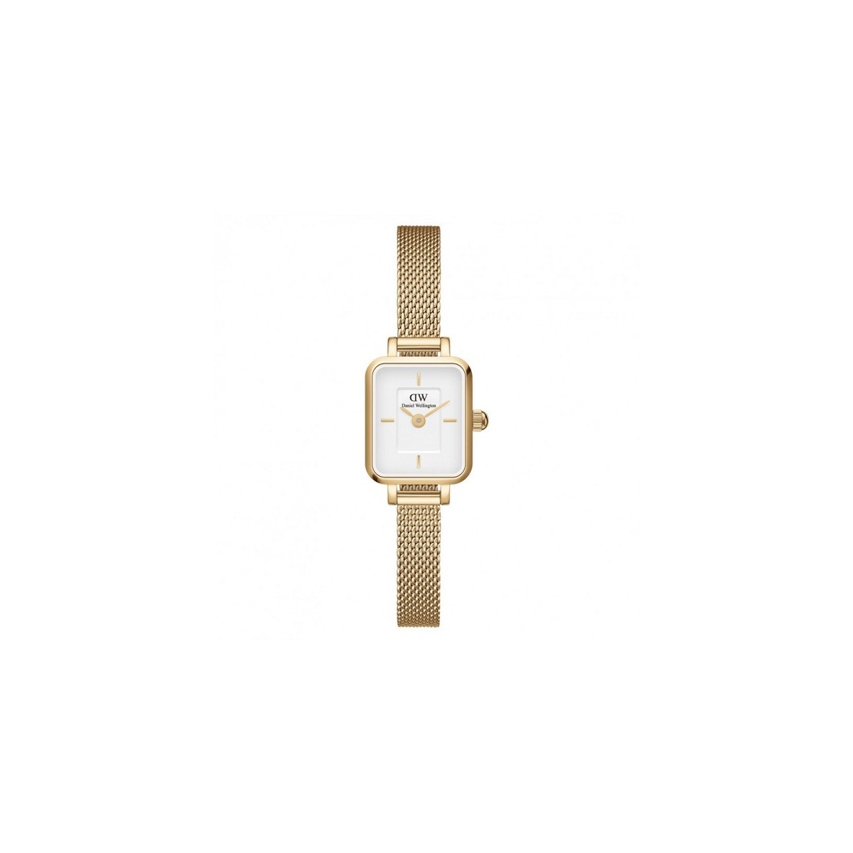 Orologio mini donna Daniel Wellington, della collezione Quadro, con funzione di solo tempo e movimento al quarzo. L'orologio è realizzato con cassa in acciaio inox con finitura dorata dal diametro di 15,4 mm x 18,2 mm. Quadrante bianco con indici a bastoni e logo nella parte alta, cinturino in maglia milano d'acciaio anallergenico; chiusura con fermaglio di sicurezza.
