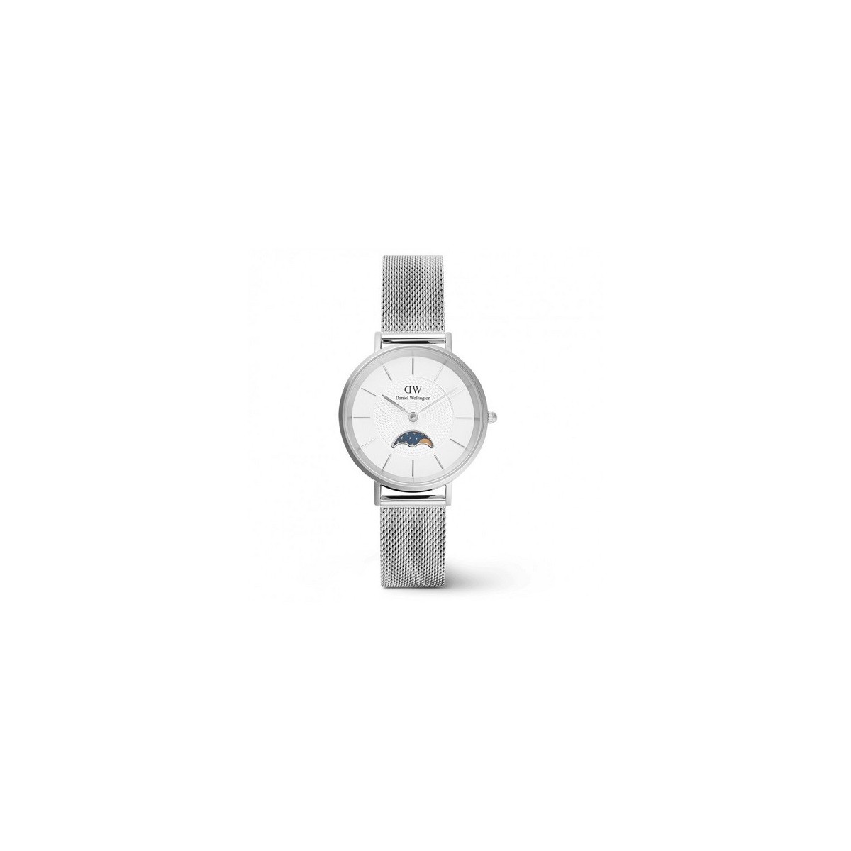 Orologio della linea Petite Lune 32mm, quadrante bianco con fasi lunari. Cinturino in maglia Milano, chiusura con fermaglio di sicurezza.