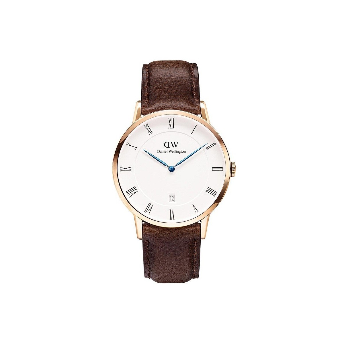 Orologio uomo-donna Dapper Bristol con cassa ultra sottile,quadrante guscio d'uovo e cinturino in pelle marrone testa di moro, cassa rosè,numeri romani, segnatore di data e lancette blu metallizzate.