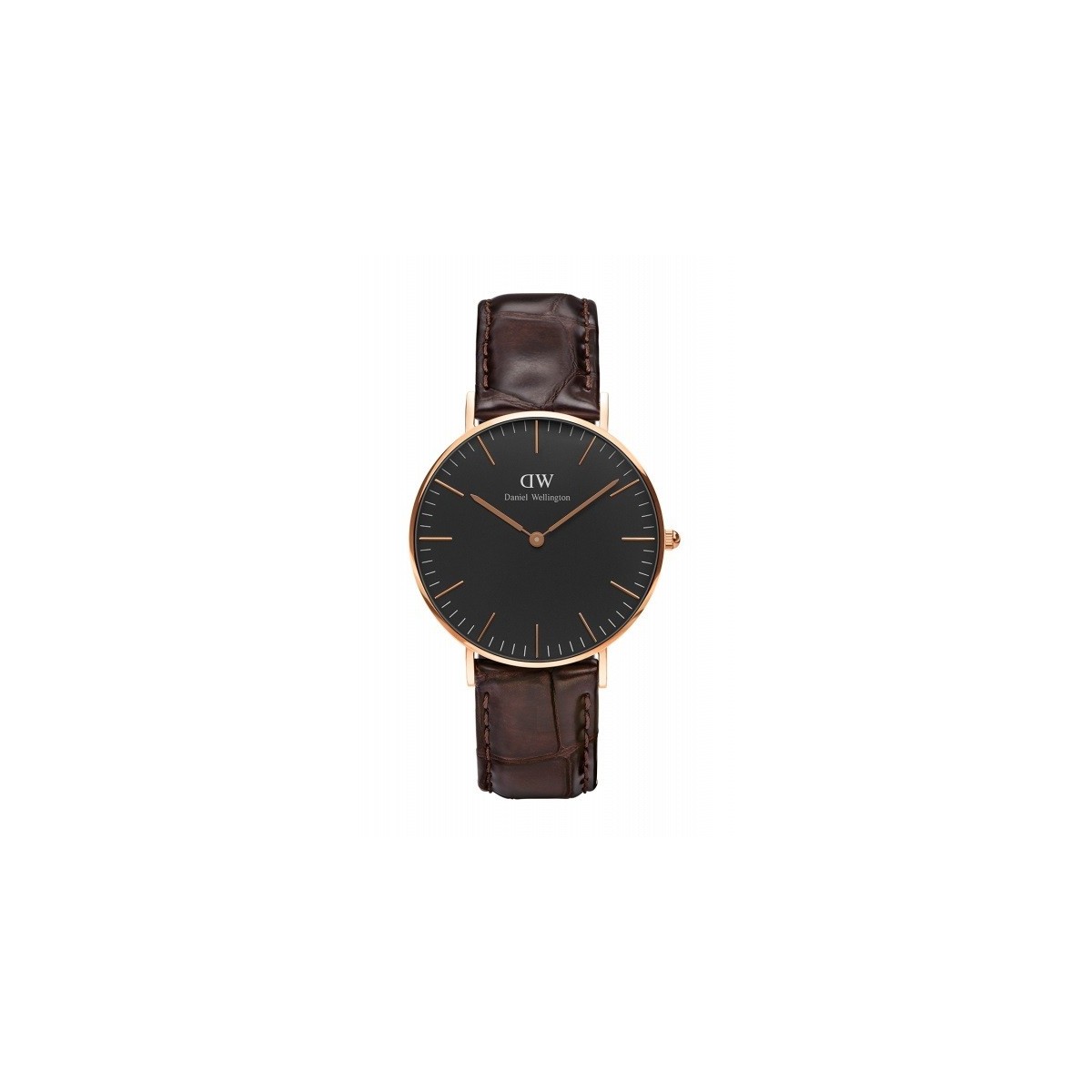 Orologio linea Classic Black York piccolo con cassa in acciaio PVD rosè, con movimento al quarzo solo tempo, quadrante nero e cinturino in pelle stampa coccodrillo marrone - DW00100140