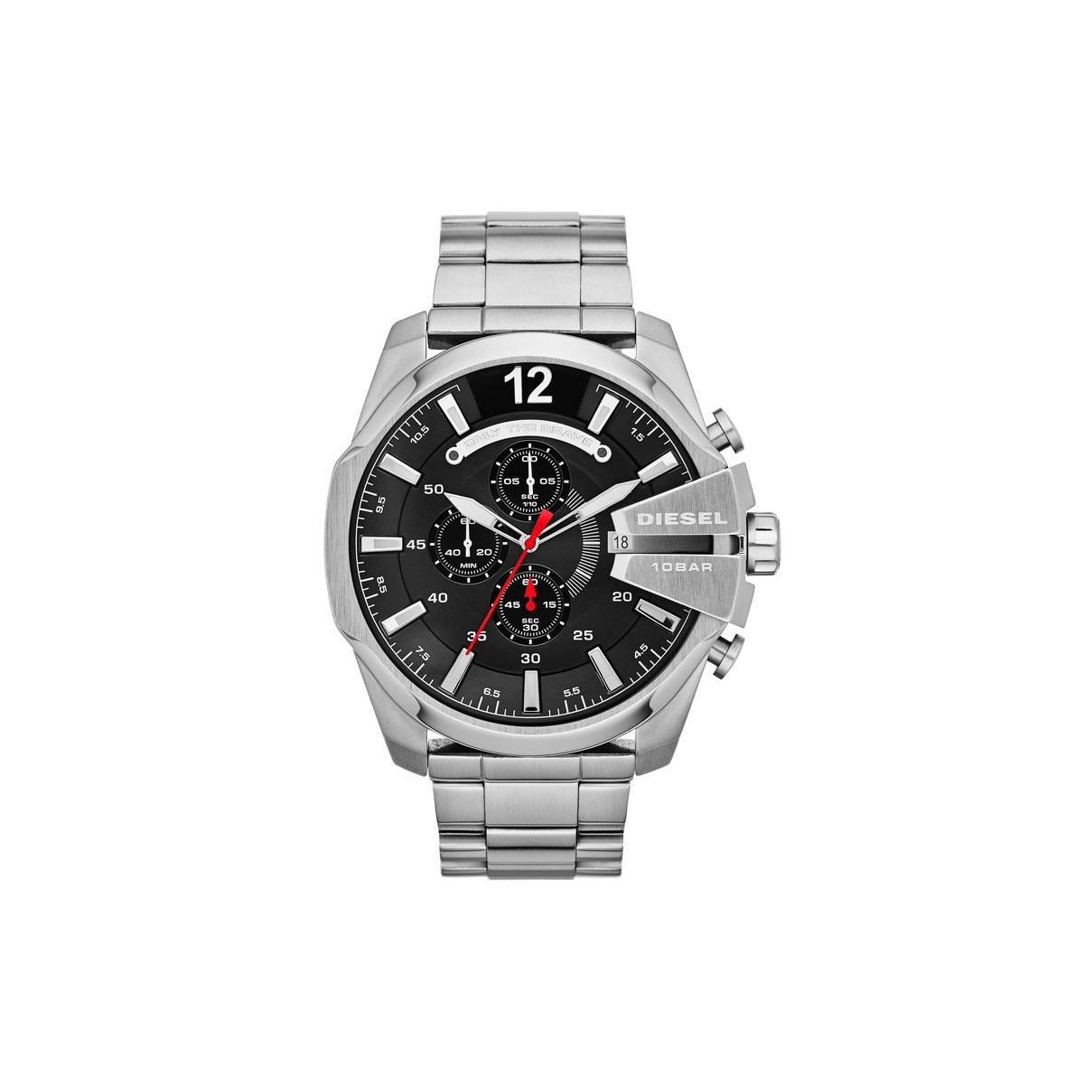 Orologio uomo con cassa e cinturino in acciaio lucido e satinato, quadrante nero con lancette rosse, movimento cronometro al quarzo