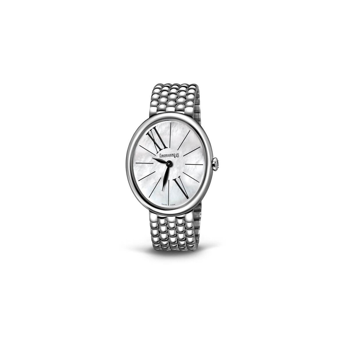 Orologio da donna Eberhard, della collezione Gilda, con funzione di solo tempo e movimento al quarzo. Orologio realizzato in acciaio lavorato lucido con bracciale a maglia meshe e cassa di forma ovale 32x38 mm montante vetro zaffiro antigraffio e antiriflesso, quadrante in madreperla bianco con alternanza di numeri romani ed indici e lancette di colore nero. Chiusura deployante con logo Eberhard&Co. in rilievo.