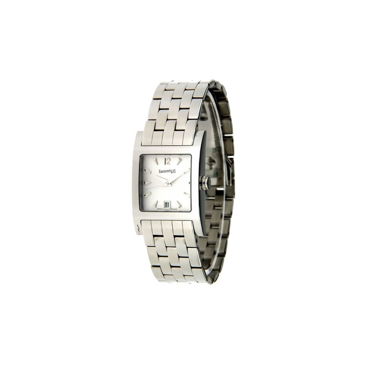 Orologio da donna Eberhard, della collezione Gingi, con funzione di solo tempo e movimento al quarzo. Orologio realizzato in acciaio lavorato lucido con bracciale a maglia charade e cassa rettangolare 22x33 montante vetro zaffiro antigraffio e antiriflesso, quadrante bianco con lancette ed indici in acciaio e datario posto ad ore 6. Chiusura deployante.