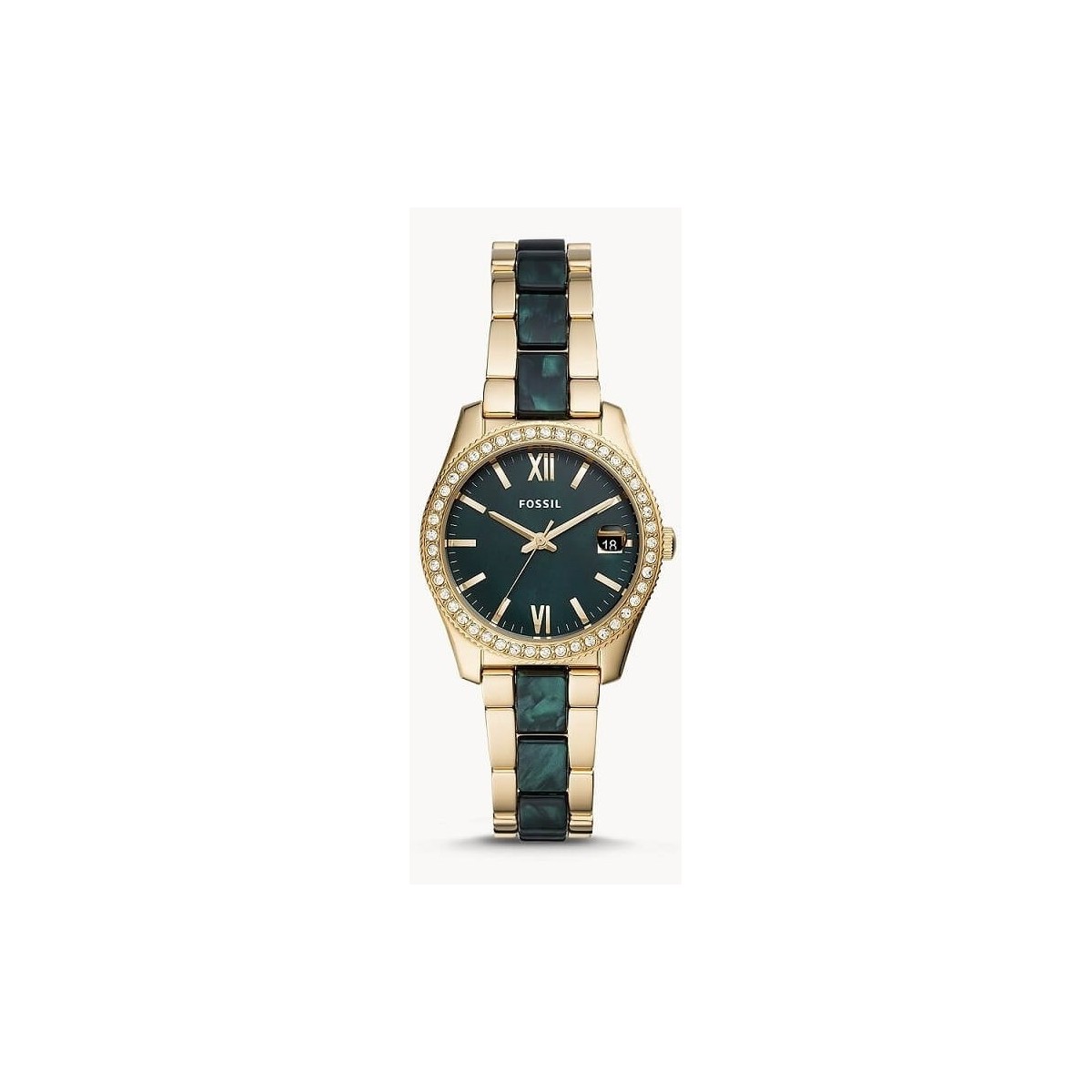 Orologio femminile collezione Scarlette con movimento al quarzo, cinturino in acciaio bicolore dorato e acetato verde, cassa dorata, ghiera con swarovski bianchi, quadrante verde con indici e lancette oro, datario a ore 3.