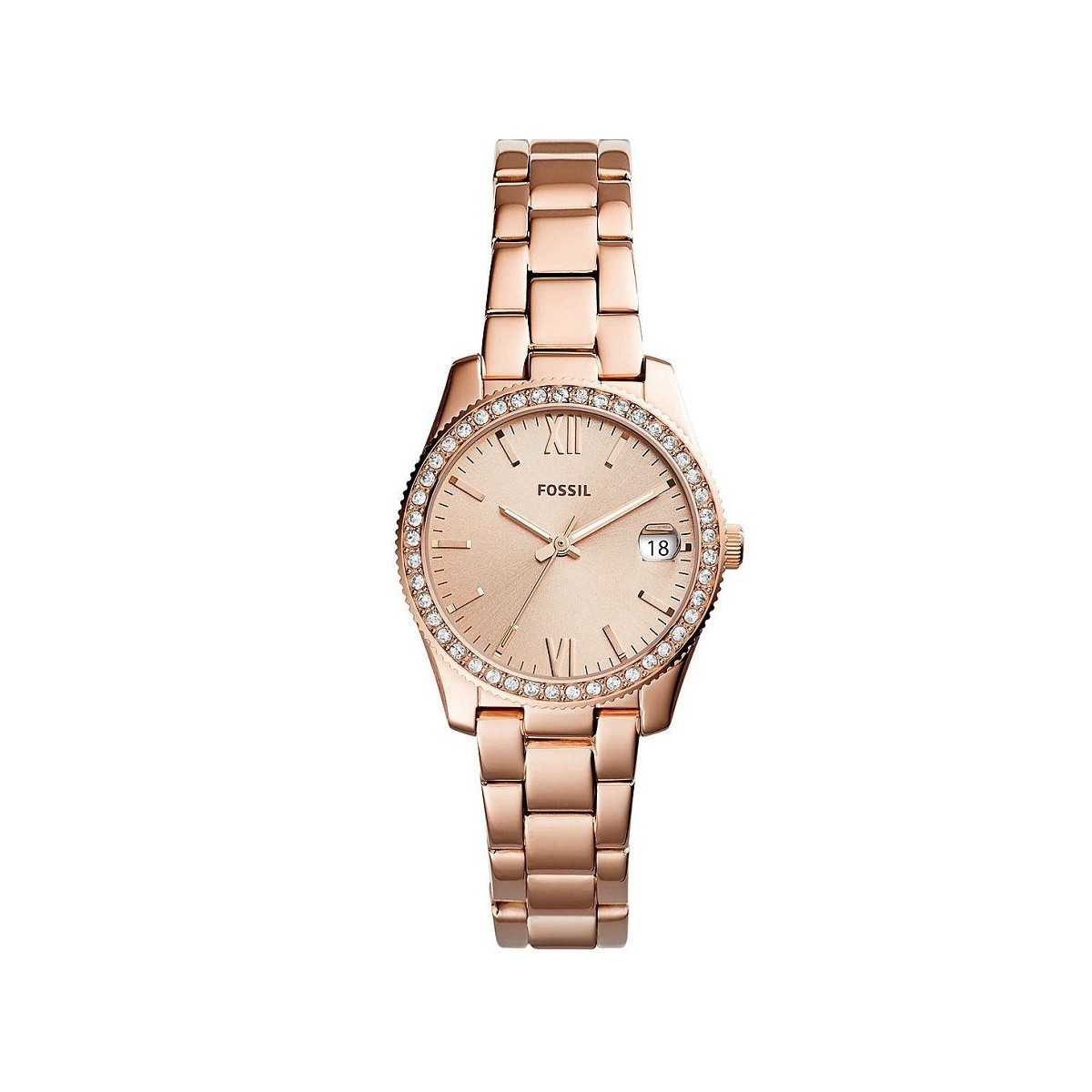 Cassa rotonda in acciaio inossidabile rosè con finitura mista e pietre sulla ghiera, diametro 32mm; quadrante rosa, vetro trasparente con indici a bastone, numeri romani rosè e lancette bianche con l'aggiunta del datario.