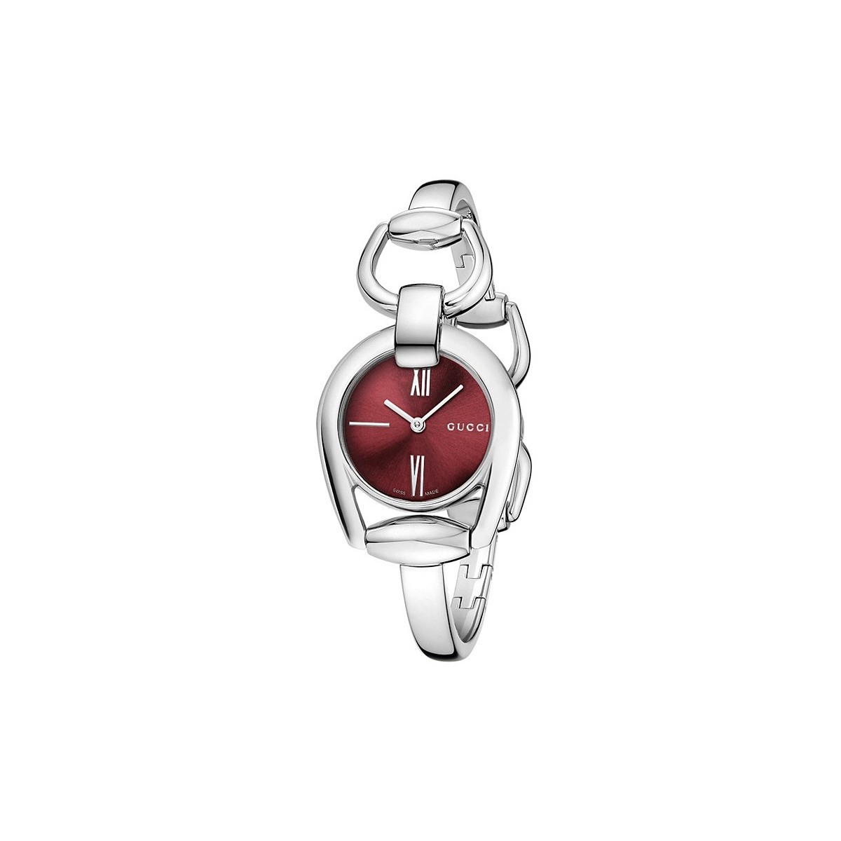 L' Orologio Gucci Horsebit Small è dotato di cassa in acciaio e quadrante spazzolato rosso con bracciale bangle in acciaio