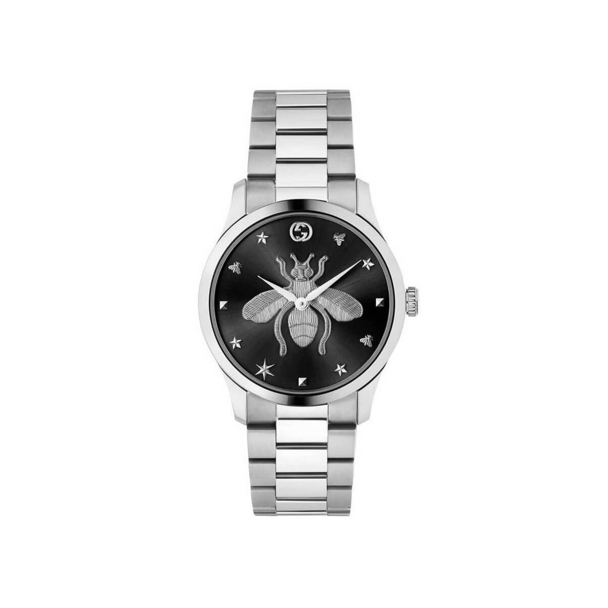 Orologio collezione G-Timeless Iconic con cassa in acciaio, quadrante nero con motivo ape i simboli, bracciale in acciaio e movimento al quarzo