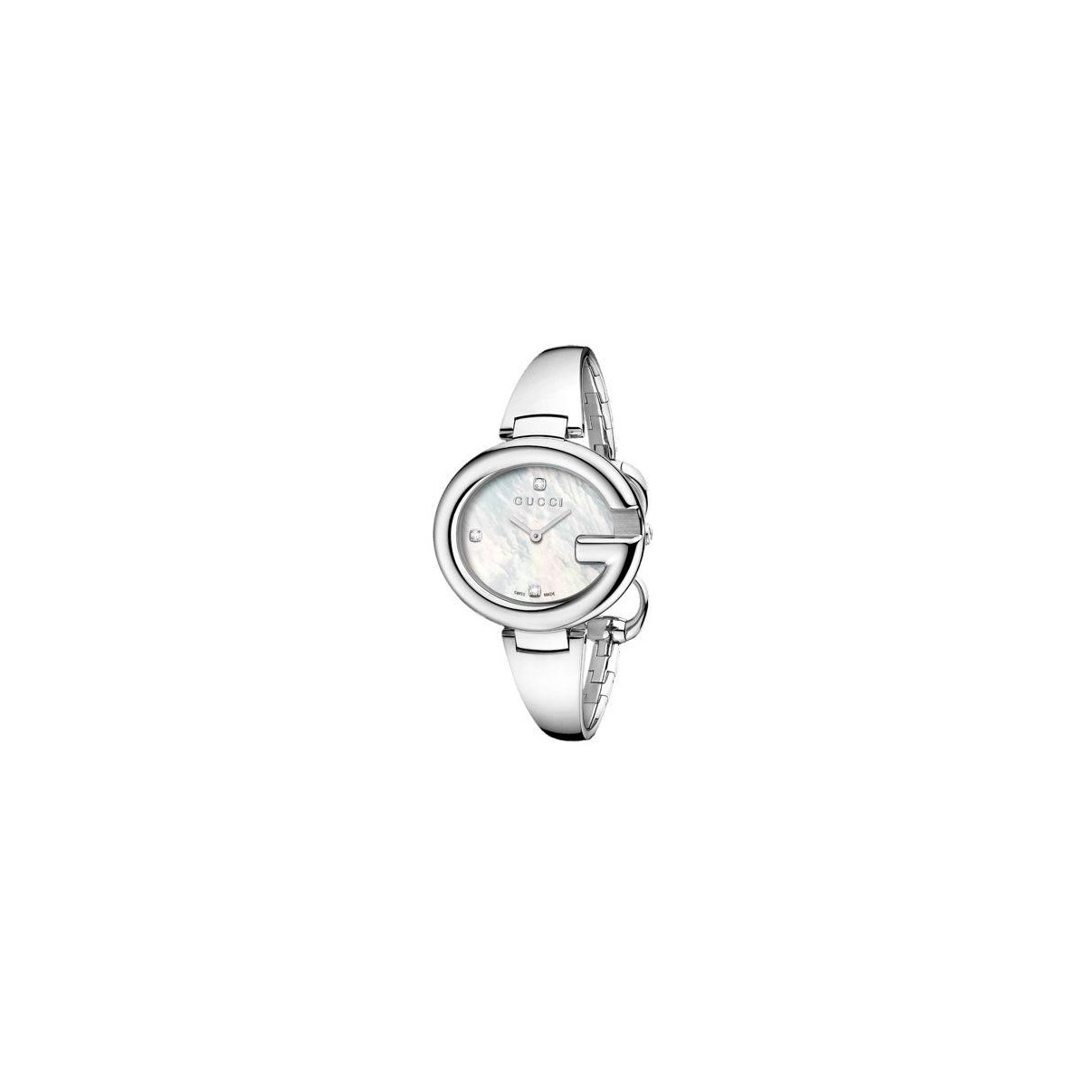 L' orologio Collezione Guccissima Large Gucci donna con cassa in acciaio, quadrante in madreperla bianca con incastonati 3 diamanti e bracciale bangle in acciaio resta sempre chic ed essenziale qualunque sia l'occasione ma soprattutto speciale con i suoi pregiati diamanti che illuminano il polso della donna che lo indossa.