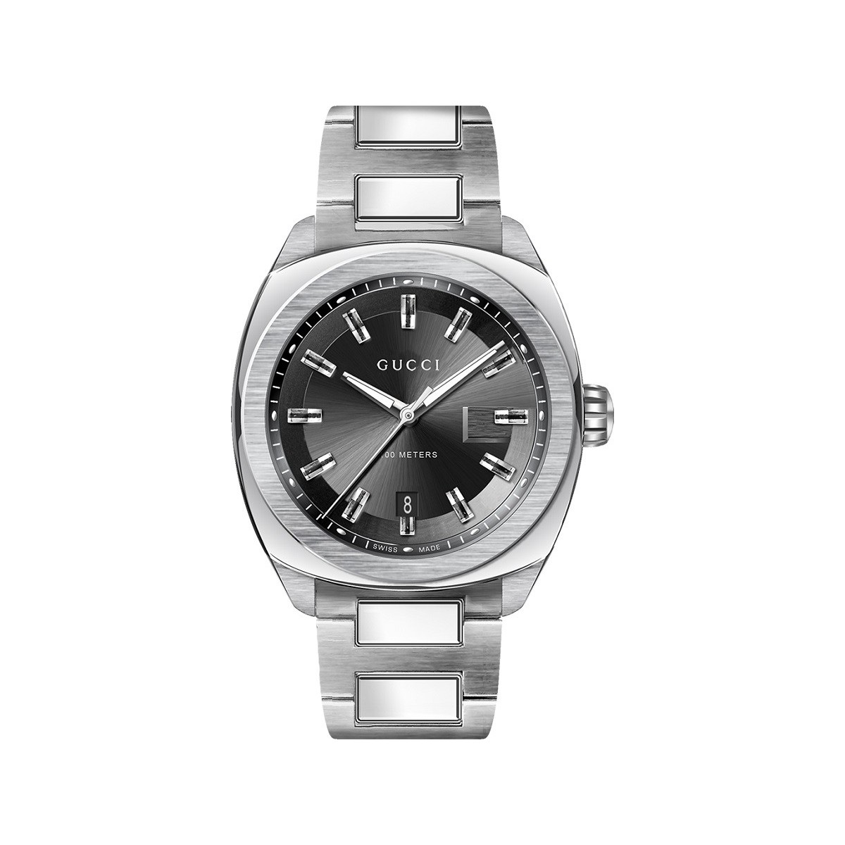 Orologio linea GG 2570 extra large, cassa e bracciale in acciaio, movimento al quarzo, quadrante nero, modello vintage anni 70