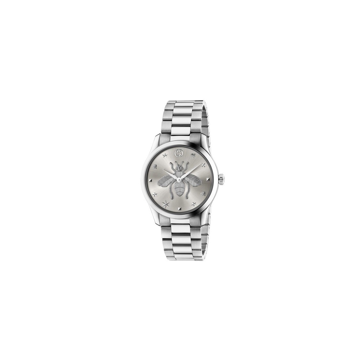 Questo orologio con cassa e bracciale in acciaio, un quadrante in argento spazzolato soleil, fa parte delle nuove introduzioni della linea G-Timeless per la collezione Pre-Fall 2019. Al centro del quadrante troviamo un'ape, circondata da altri simboli, come la stella e il dettaglio GG, raffigurati sotto forma di lancette.
