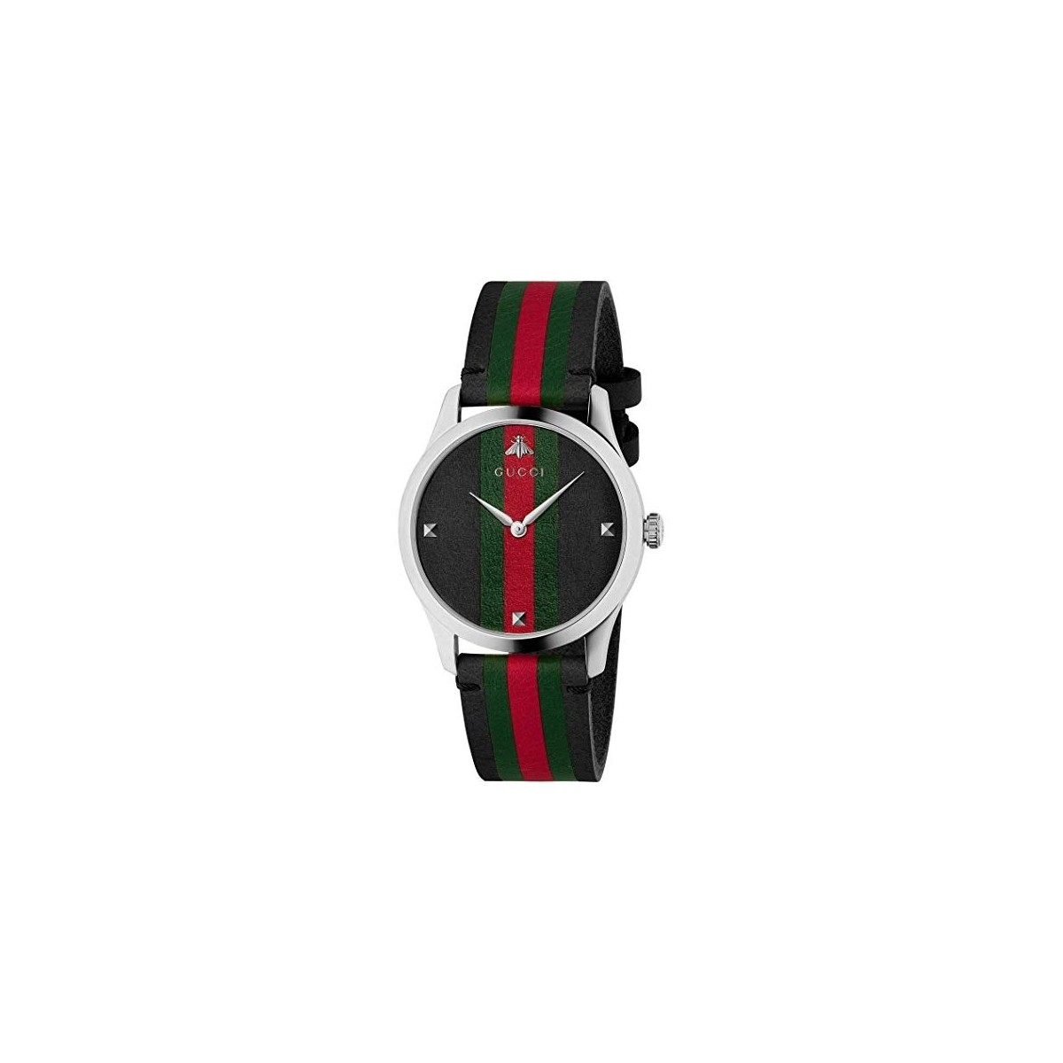 Questo orologio della collezione G-Timeless presenta il classico nastro Web che rende omaggio al mondo equestre. Il motivo a righe è all'interno del quadrante e continua nel cinturino. Cassa in acciaio, quadrante e cinturino in pelle nera, web verde e rosso.