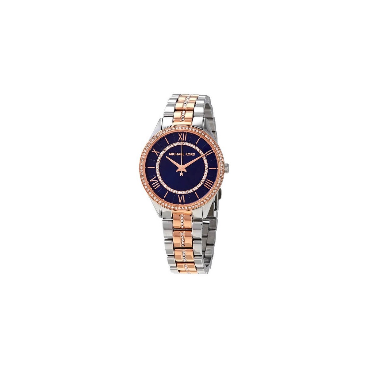 Orologio da donna Micheal Kors, della collezione Runway, con funzione movimento al quarzo. L'orologio è realizzato con bracciale a maglie lavorato lucido placcato oro rosa e argento impreziosito da pietre bianche di colore bianco, cassa 33 mm realizzata in acciaio inossidabile con finitura lucida di colore blu e di forma rotonda, ghiera impreziosita da piccole pietre di colore bianco, vetro minerale. Chiusura Deployante.