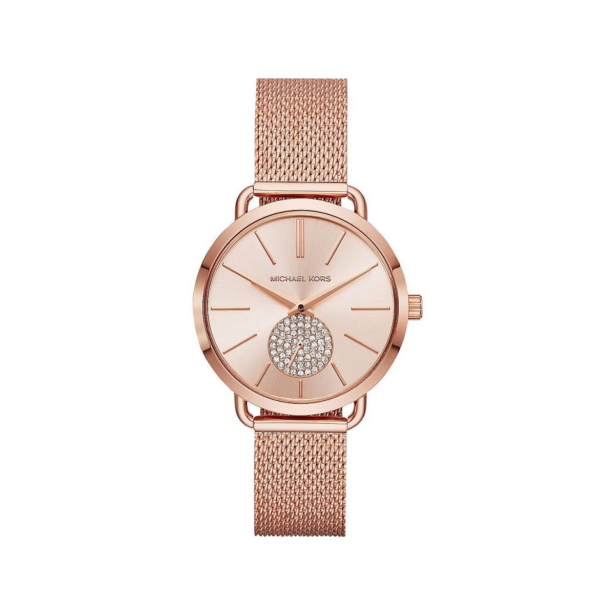 Cassa rotonda in acciaio inossidabile rosè del diametro di 37 mm e dello spessore di 8mm; quadrante rosa con vetro trasparente, indici e lancette rosa, e contasecondi pavè bianco.