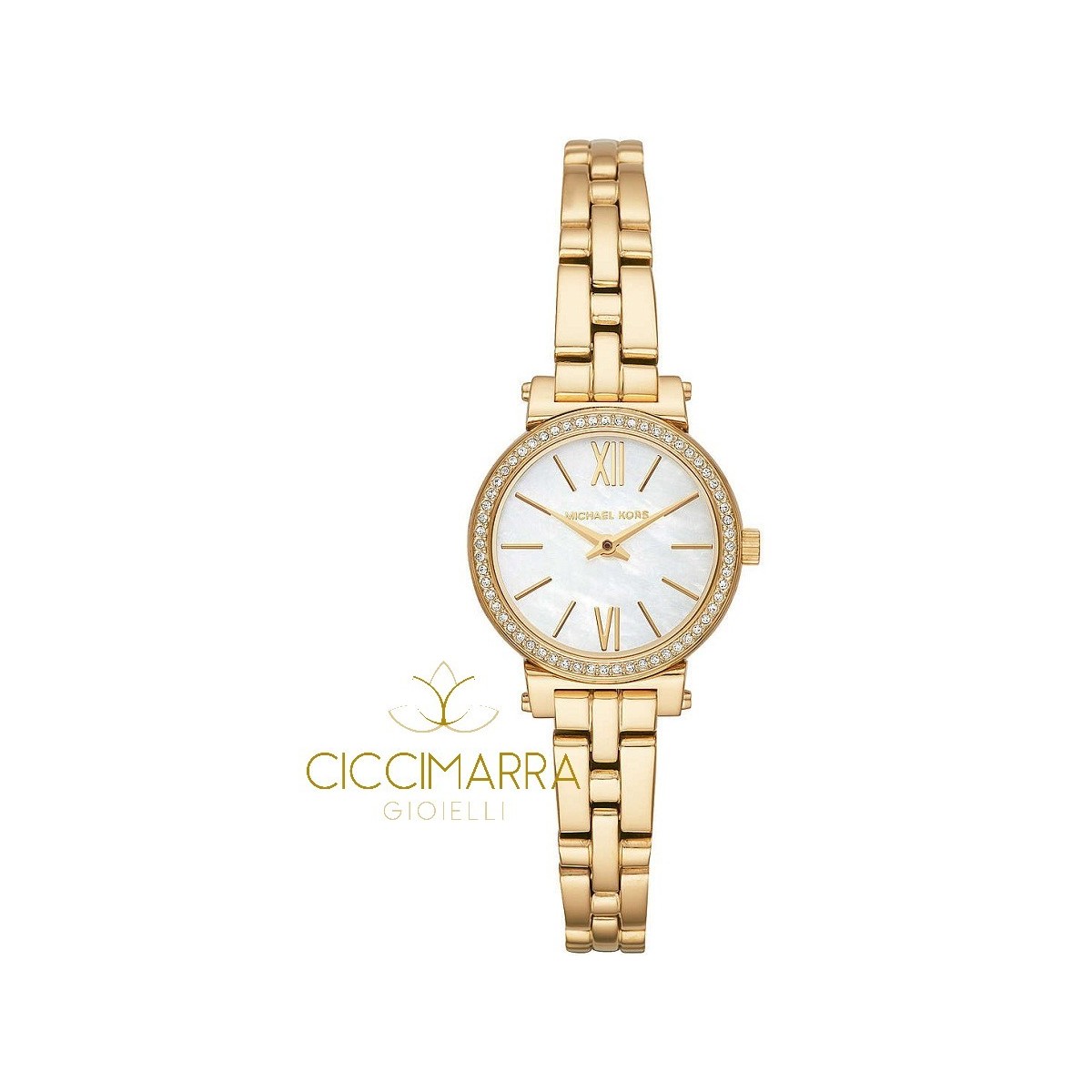 Cassa rotonda in acciaio inossidabile dorato con ghiera in pavè di cristalli e quadrante in madreperla del diametro di 26mm e dello spessore di 7mm; lancette, indici e numeri romani sono di colore dorato. Bracciale in acciaio inossidabile dorato largo 9mm quindi estremamente elegante e femminile, chiusura deployant.