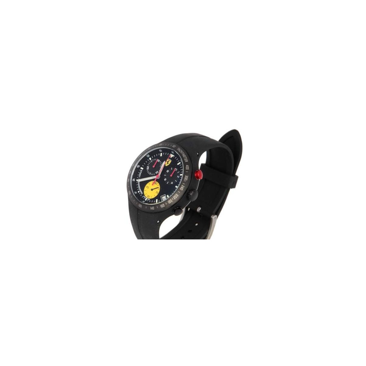 Cronometro al quarzo della prestigiosa casa automobilistica di Maranello, carattere sportivo e dettagli ricercati come la cassa avvolta dal caucciù del cinturino, il quadrante nero con piccoli numeri arabi bianchi ed il cinturino con chiusura ad ardiglione in caucciù nero. Fondello cassa in titanio con logo Scuderia Ferrari inciso