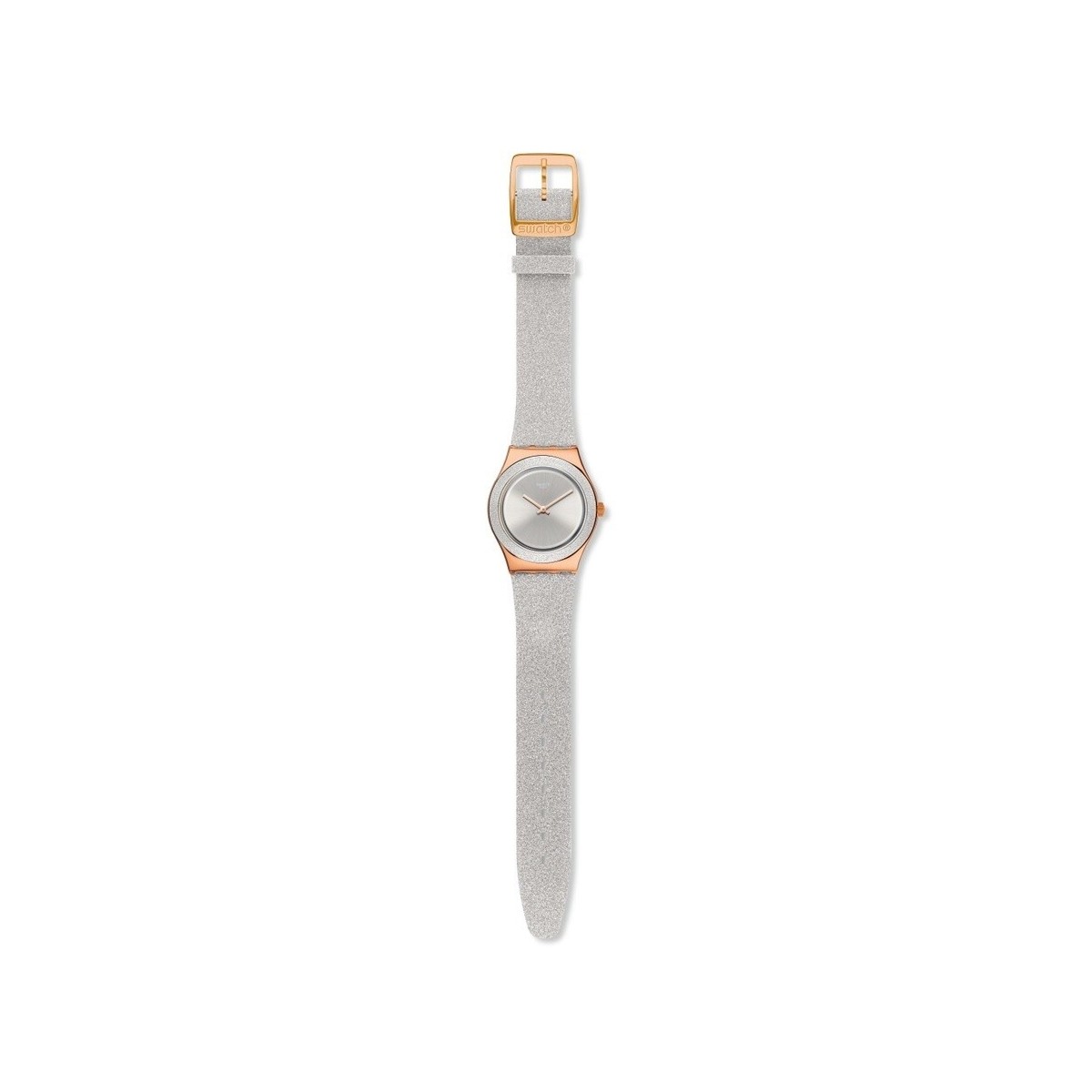 Orologio Swatch grey sparkle della collezione I Medium Standard con movimento solo tempo al quarzo, cassa in acciaio di colore oro rosa pvd e di forma rotonda da 33 mm e cinturino in cuoio e materiale sintetico di colore argento con effetto scintillante