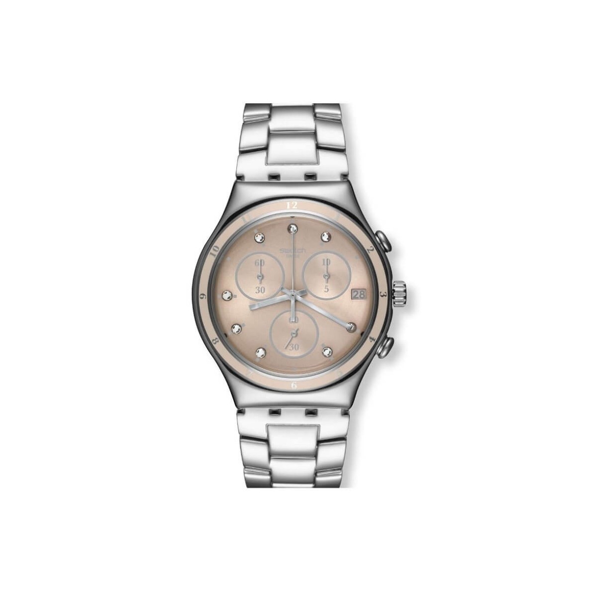 Orologio cronografo al quarzo Swatch Irony in acciaio con quadrante colore rosa antico e ghiera colore crema.