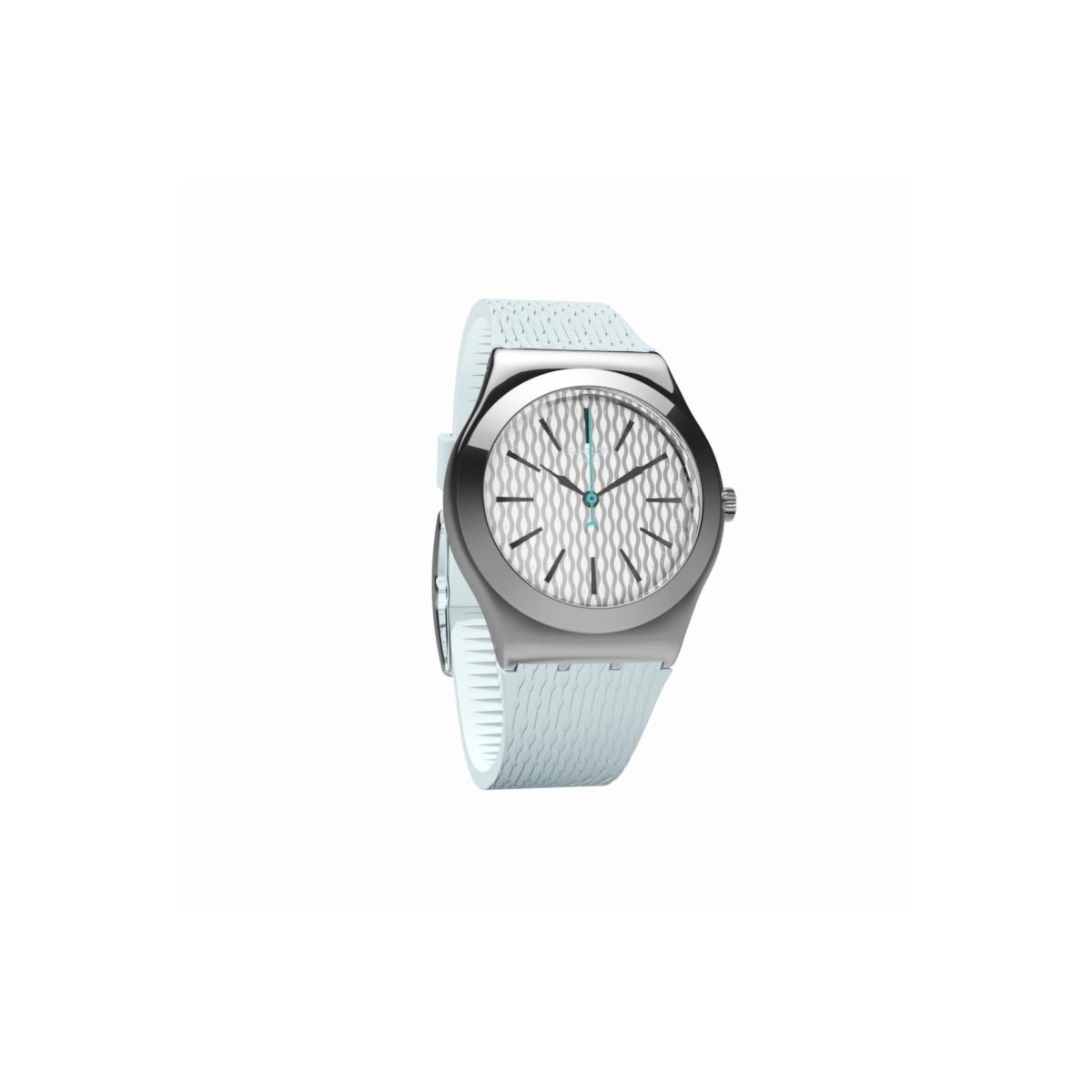 Orologio donna movimento al quarzo con quadrante in alluminio grezzo ed indici bianchi azzurri con stampa argentata. Cassa in acciaio, cinturino in gomma satinata azzurra dalla texture a rilievo colore azzurro cielo