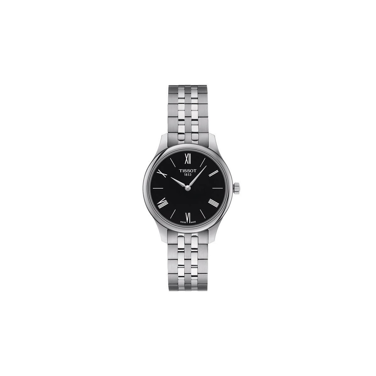 Orologio Femminile Tradition 5.5 Tissot, della collezione T-Classic, con funzione di solo tempo e movimento svizzero, al quarzo, realizzato in acciaio inossidabile 316L, con cassa del diametro di 31mm e vetro zaffiro ed antigraffio che protegge il quadrante di colore nero con indici romani e lancette argentate. Lo spessore sottile di 5,5mm amplifica la purezza e sottolinea l'eleganza del Tissot.