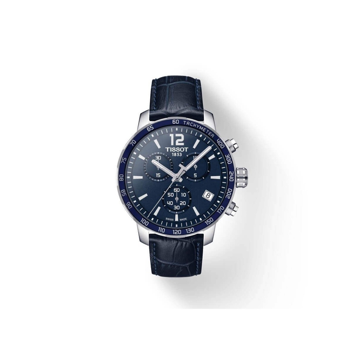 Orologio da uomo Tissot Quickster, della collezione T-Sport, con funzione cronografo e movimento al quarzo. L'orologio è realizzato con cinturino in pelle di colore blu e motivo crocodile, cassa in acciaio 42 mm con ghiera blu e quadrante blu con alternanza di indici e numeri arabi, lancette LumiBrite e datario ad ore 4. Chiusura con fibbia standard. L'orologio dispone di alcune funzioni aggiuntive: Contatori 30 Minuti E 1/10 Di Secondo, Lancetta Cronografo Centrale Dei 60 Secondi, Funzioni Add E Split.