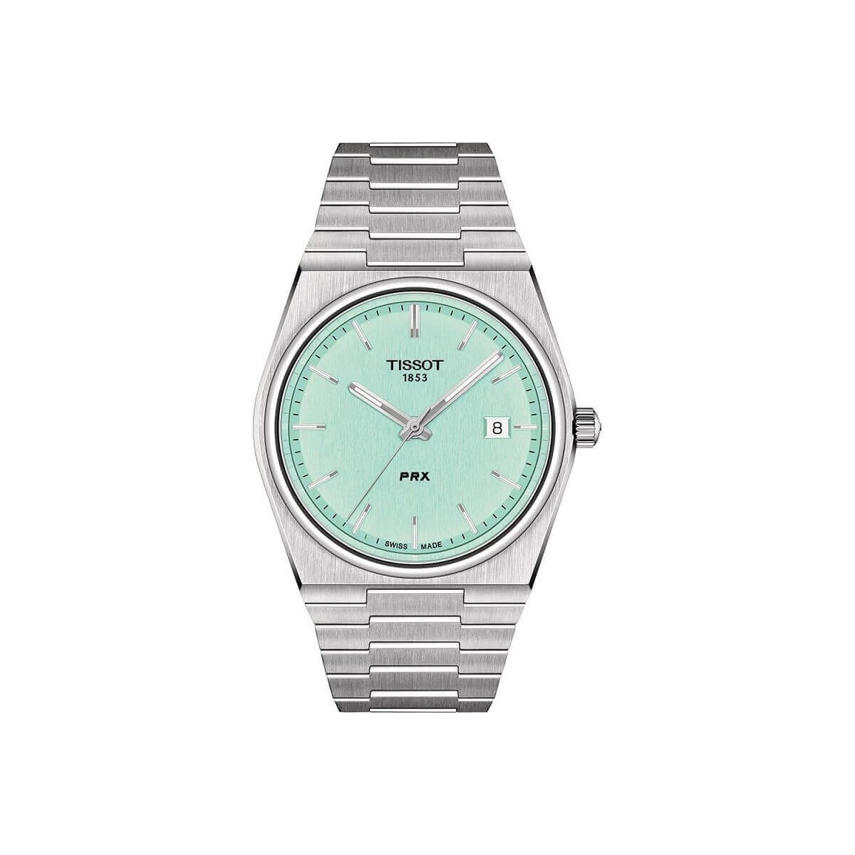 Orologio maschile Tissot, della collezione Prx, con funzione di solo tempo e movimento al quarzo. L'orologio è realizzato in acciaio 316L con bracciale a maglie lavorato lucido e satinato, cassa in acciaio 40 mm, montante vetro zaffiro con lavorazione antigraffio ed antiriflesso e quadrante verde tiffany con lancette SuperLumiNova. Datario posto ad ore 3 e fondello con movimento a vista.