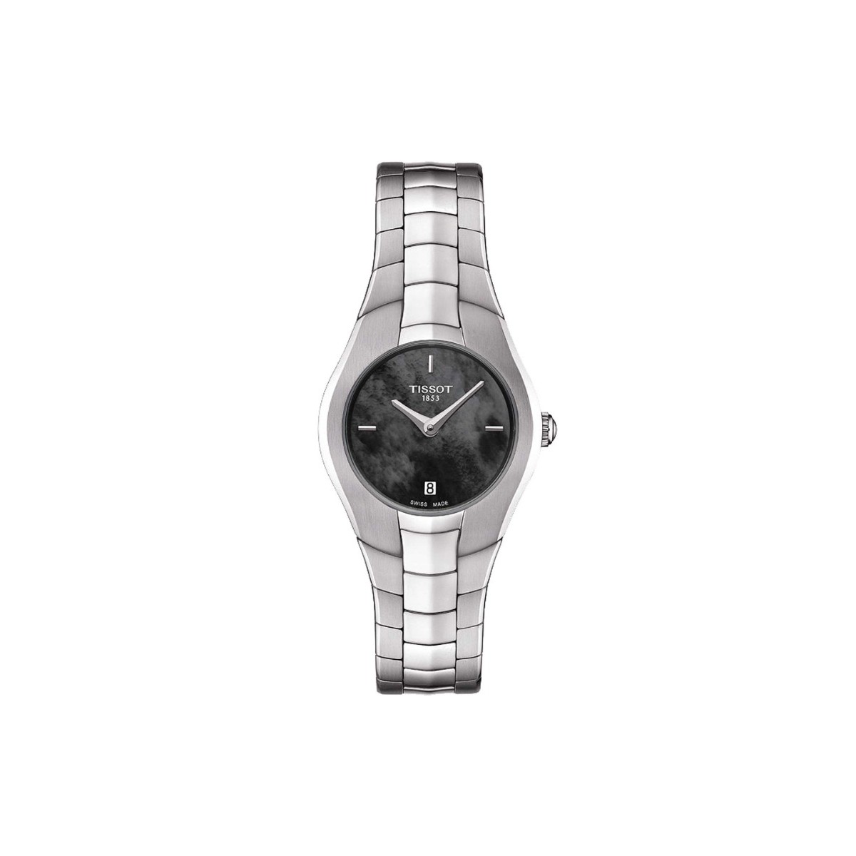 Orologio Tissot T-Round da donna con cassa e bracciale in acciaio e quadrante inero con datario
