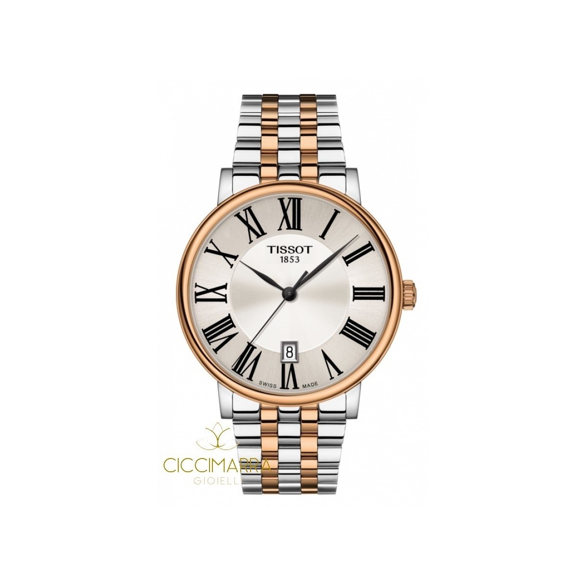 Orologio lady della collezione T-Classic con cassa e cinturino in acciaio bicolor, quadrante silver e movimento al quarzo, indici con numeri romani e datario a ore 6 . Il suo design è sottolineato da indici e sottili lancette curve e impreziosito dall’elegante lunetta a “doppio gadroon”.ReferenzaT1222102203301 ; swiss made;Garanzia 2 anni;Collezione T-Classic;Forma della cassa Rotondo; Impermeabile fino a 5 bar (50 metri/165 piedi) Materiale della cassa: acciaio 316 L con trattamento PVD oro rosa;Lunghezza 30;Larghezza 30;Anse 15;Spessore 6.7;Peso (g) 70; Vetro zaffiro antigraffio;Colore del quadrante Argento;Indici Romani;Movimento Svizzero, al quarzo;Dettagli del cinturino Acciaio inossidabile;Colore cinturino Grigio;Fibbia chiusura a farfalla con pulsanti