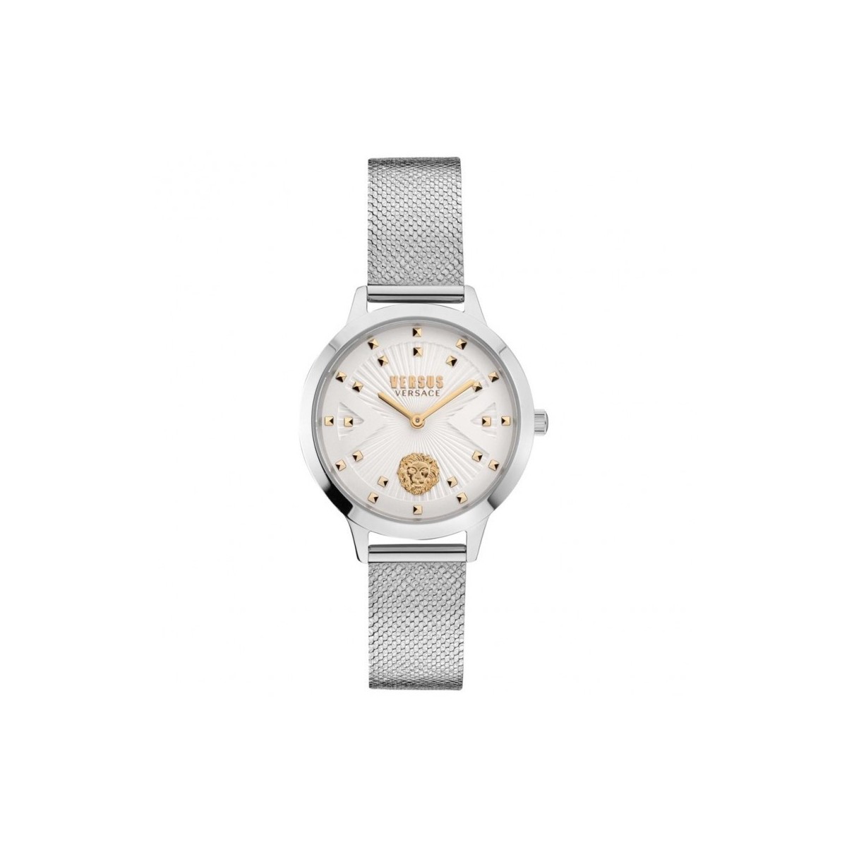Orologio donna Versus con bracciale maglia milano mesh e quadrante silver e lancette, indici e logo Versus color oro.