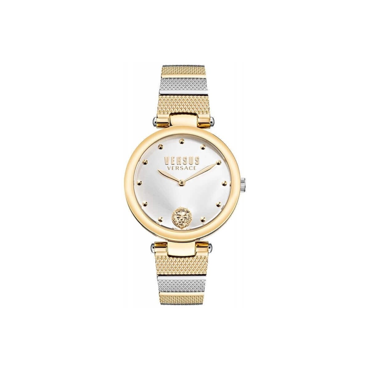 Orologio Versus Versace con cassa placcata oro e bracciale in acciaio misto, quadrante argento con lancette, indici e logo Versace a ore 6 dorati.