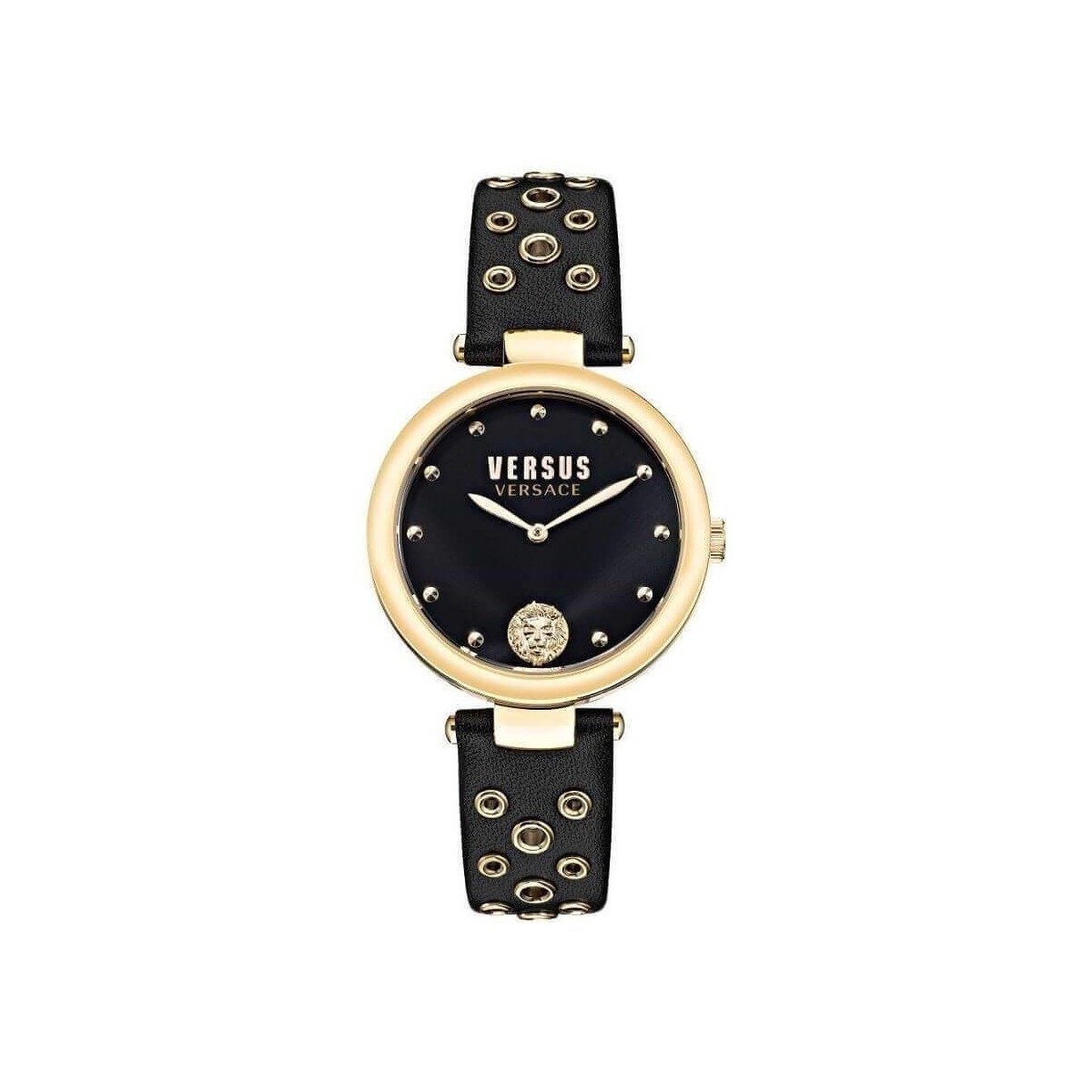 Orologio Versus Versace con cassa in acciaio placcato oro, cinturino in pelle con dettagli e quadrante nero con lancette, indici e logo Versace a ore 6 dorati.